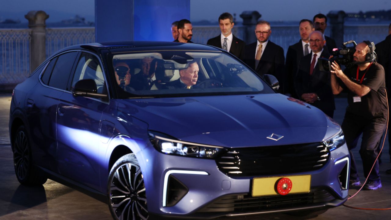 Cumhurbaşkanı Erdoğan, plakasına Cumhurbaşkanlığı forsu takılan Togg'un mavi renkli yeni modeliyle test sürüşü yaparken, araç hakkında bilgi aldı.