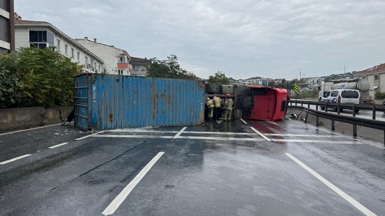 D-100 kara yolu Edirne istikametinde seyir halinde olan ve sürücüsünün ismi öğrenilemeyen TIR, Büyükçekmece mevkisinde yağışın etkisiyle kayganlaşan yolda, kontrolden çıkarak devrildi.