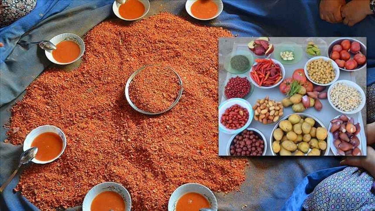Diğer tarhanalardan farklı olarak domates, biber, soğan ve nohut gibi temel malzemelerin yanı sıra biberiye, kuşburnu, alıç, hünnap, kızılcık, elma, sarımsak, ayva, nane, iğde, haşlanmış kuru fasulye ve patates gibi tam 16 çeşit meyve ve sebzenin kullanıldığı tarhananın harcı odun ateşinde hazırlanıyor.