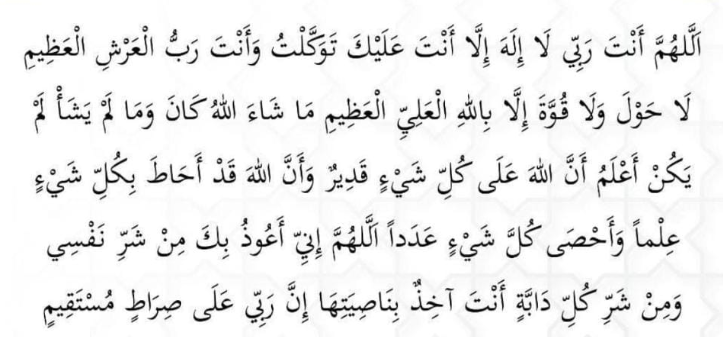 Allâhümme ente Rabbî lâ ilâhe illâ ente, aleyke tevekkeltü ve ente Rabbü'l-Arşi'l-Azıym, lâ havle ve lâ kuvvete illâ billâhi'l-Aliyyi'l-Azıym, mâ şâ'allâhü kâne ve mâ lem yeşe' lem yekün, a'lemü ennallâhe alâ külli şey'in Kadîr, ve ennallâhe kad ehâta bi-külli şey'in ilmen, ve ahsâ külle şey'in adeden, Allâhümme inî e'ûzü bike min şerri nefsî ve min şerri külli dâbbetin, ente âhizün binâsıyetihâ, inne Rabbî alâ sırâtımmüstakıym.