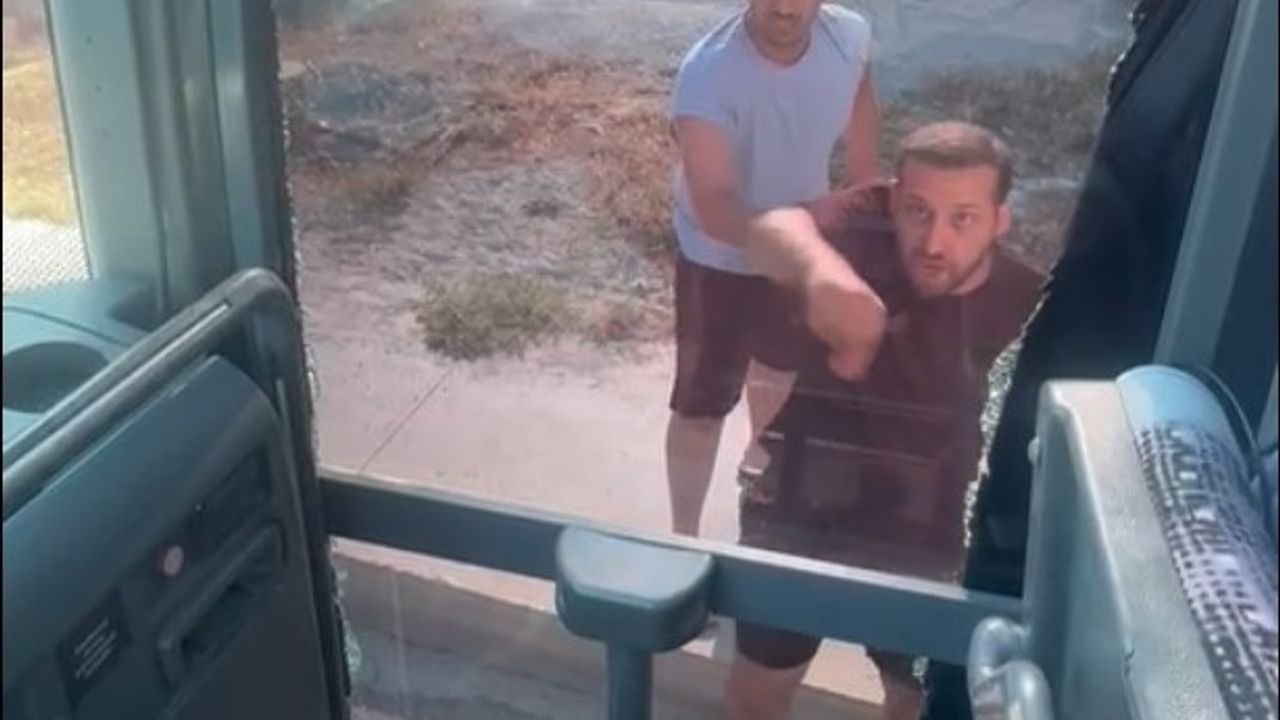 Şoförün kapıları kilitlemesinden sonra sinirlenen iki kişi otobüsün yolcu kapısının camını kırarak, şoföre sözlü saldırıda bulundu.