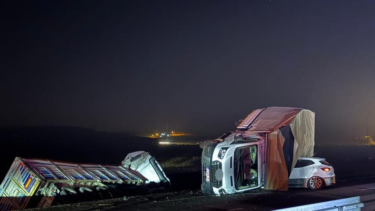 Kazada tır, çarpışmanın etkisiyle şarampole devrildi.