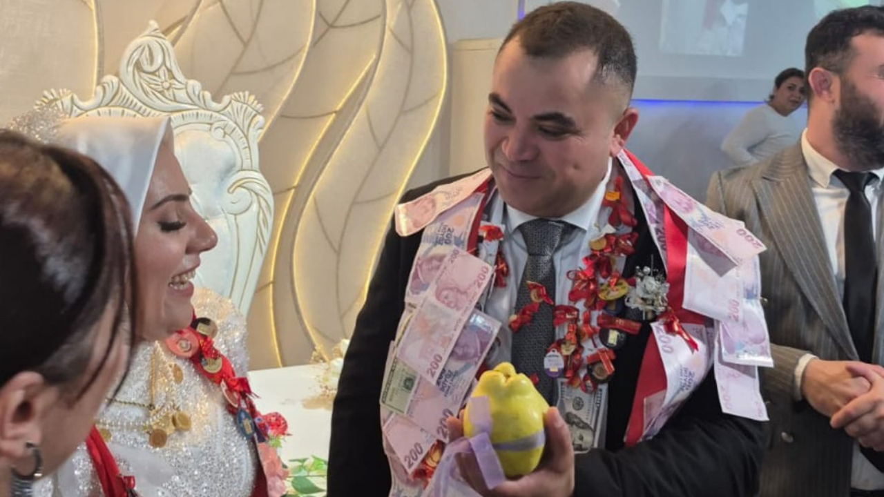 Emre ve Feruze Köse çiftinin düğününde takı merasiminde arkadaşları tarafından damada takı yerine bir tane ayva hediye edildi.