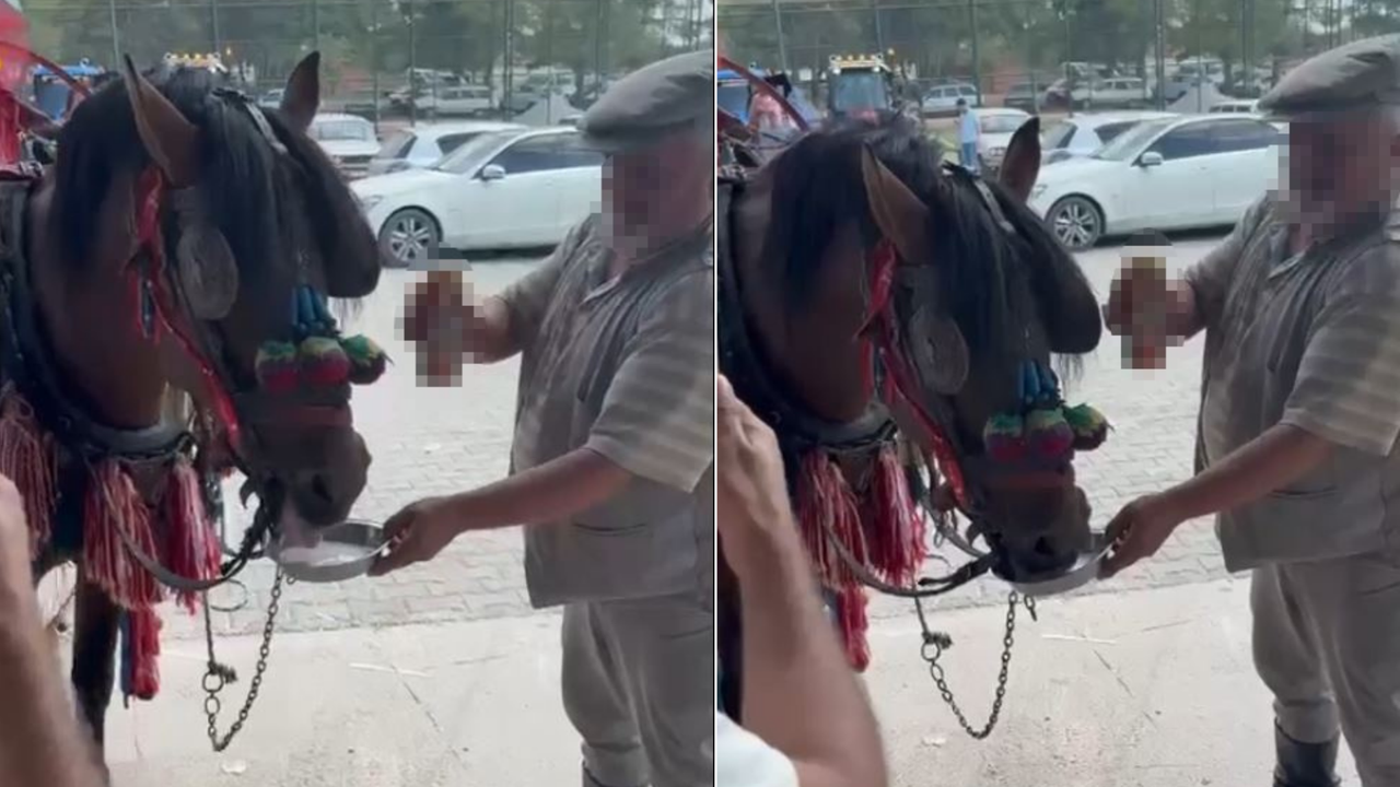 Yemek tabağı içinde ata alkol içirilmesi, vatandaşları kamerası tarafından görüntülendi.