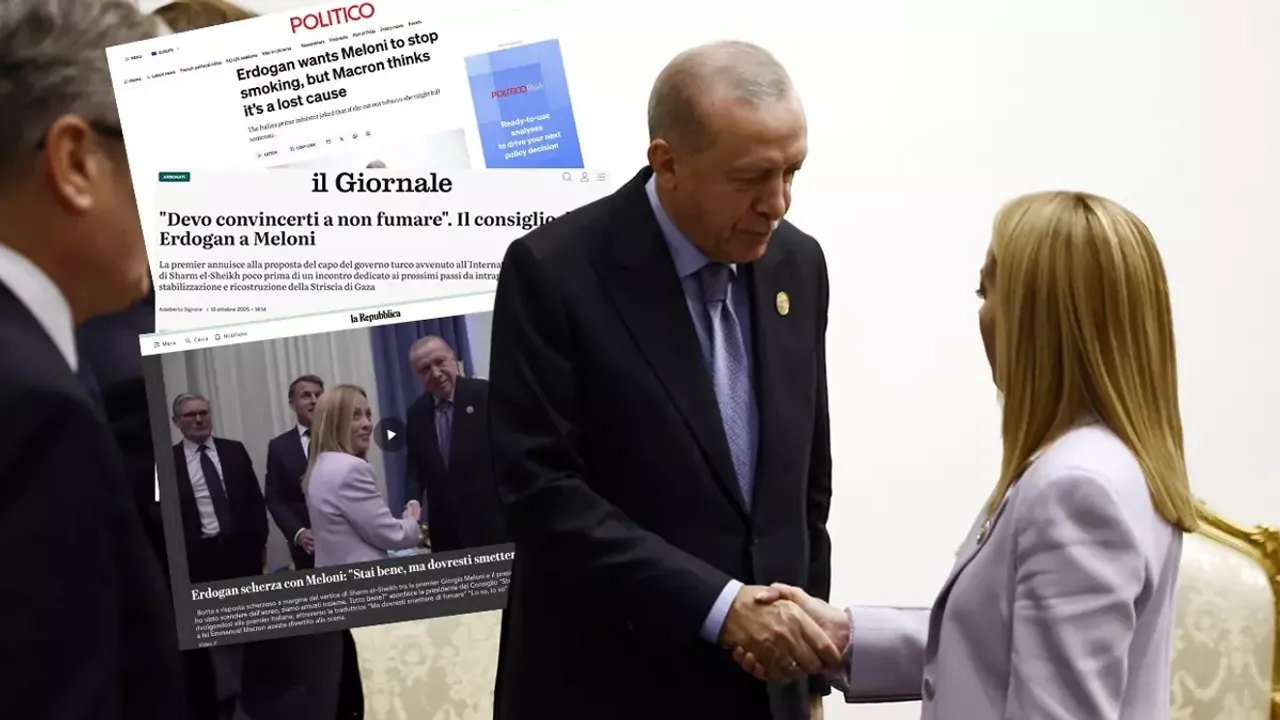 Cumhurbaşkanı Recep Tayyip Erdoğan, Mısır'ın Şarm Eş-Şeyh kentinde düzenlenen Gazze konulu Barış Zirvesi marjında İtalya Başbakanı Giorgia Meloni ile bir araya geldi. Erdoğan'ın görüşme sırasında İtalyan lidere esprili bir dille sigarayı bırakma tavsiyesinde bulunması, İtalyan ve dünya basınında geniş bir şekilde yer aldı.