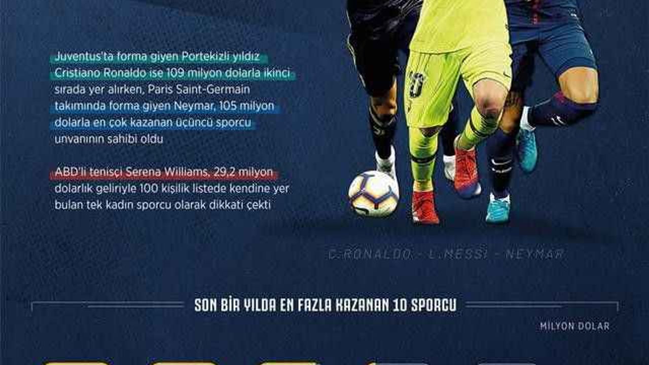 Barcelona’nın Arjantinli yıldızı Lionel Messi, 127 milyon dolarlık geliriyle listede zirvede yer alırken, İtalya temsilcisi Juventus’da forma giyen Portekizli rakibi Cristiano Ronaldo ise 109 milyon dolarla ikinci sırada yer aldı.