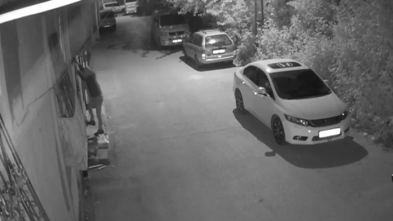 Görüntülerde, şüphelinin çaldığı kablolarla evin duvarı üzerinde yürüdüğü anlar yer aldı.