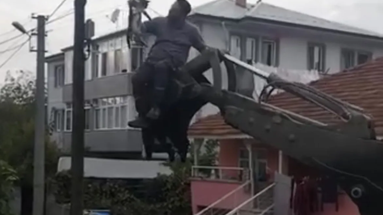 Ekipler, kepçeyi direğe yaklaştırdı ancak kedinin aşağı inmemesi üzerine bir personel kepçenin kovasına binerek direğe ulaştı.