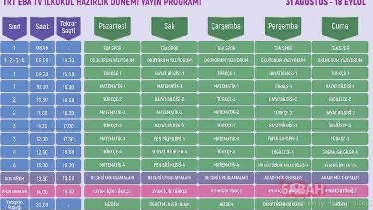 Milli Eğitim Bakanlığı (MEB), uzaktan eğitim süreci için 31 Ağustos-18 Eylül tarihleri arasında uygulanmak üzere yayımladığı haftalık ders programı ve yayın akışı bilgileri ile lise, ortaokul ve ilkokul EBA TV uzaktan eğitim ders tekrarı saatlerini açıkladı.