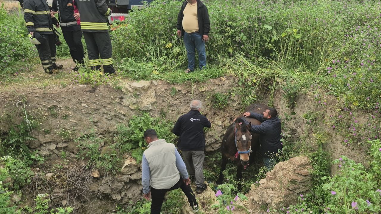 Çavuşbey Mahallesi'nde atının otlaması için bıraktığı bölgede çukura düştüğünü gören kişi, itfaiyeye haber verdi.