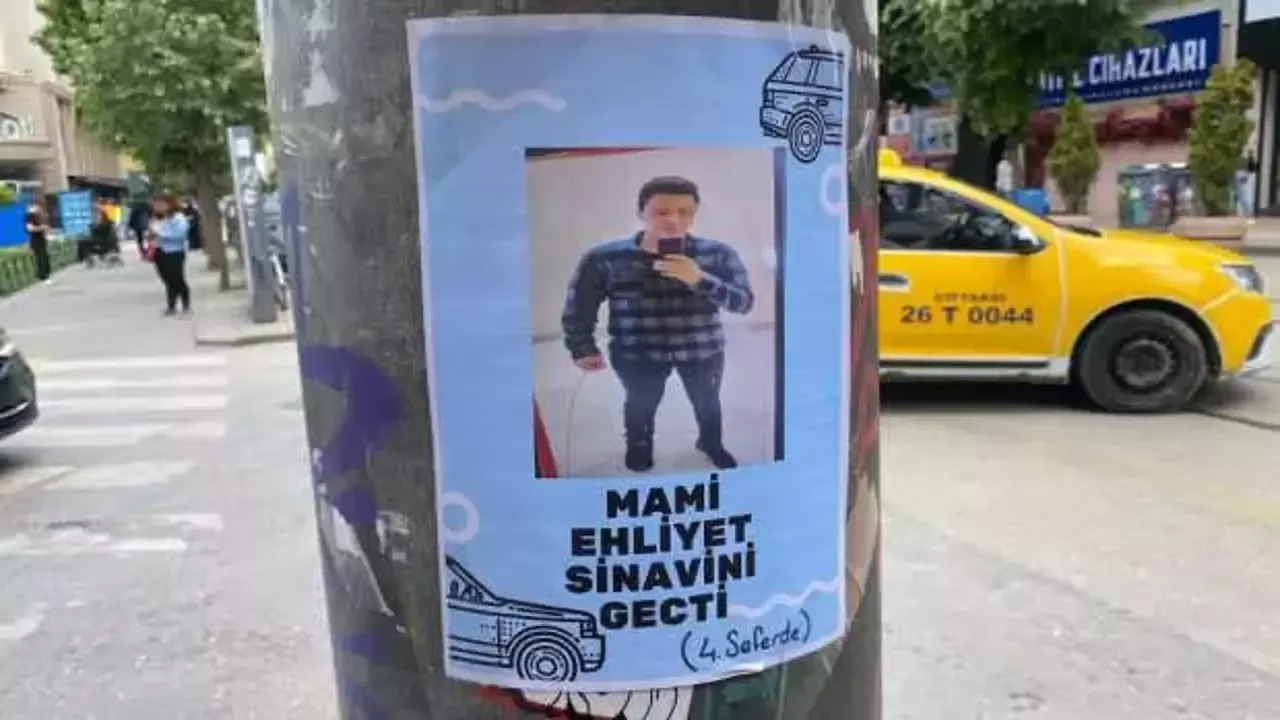 Dikkat çeken broşürde "Mami ehliyet sınavını geçti, dördüncü seferde" yazılıydı. Asılan kâğıtta ehliyet sınavından geçen kişinin olduğu tahmin edilen bir fotoğraf mevcuttu.