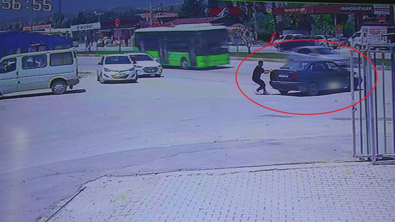 El freninin çekilmediği otomobilin ana yola gittiği ve sürücüsünün aracını yakalamaya çalıştığı o anlar ise güvenlik kamerasınca kayıt altına alındı.