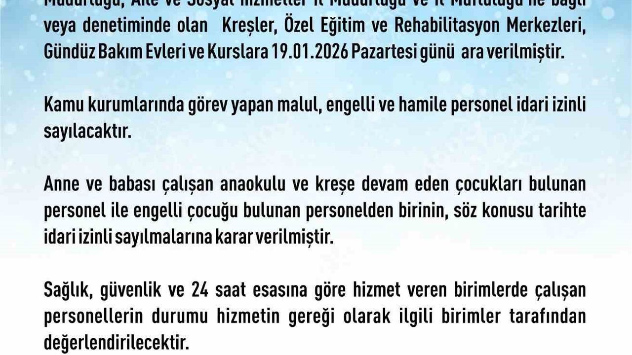 Elazığ Valiliği'nden yapılan açıklamada, 'Yoğun kar yağışı ve buzlanma nedeniyle ilimiz merkezinde Milli Eğitim Müdürlüğü, Aile ve Sosyal hizmetler İl Müdürlüğü ve İl Müftülüğü'ne bağlı veya denetiminde olan kreşler, özel eğitim ve rehabilitasyon merkezleri, gündüz bakım evleri ve kurslara Pazartesi günü ara verilmiştir. Kamu kurumlarında görev yapan malul, engelli ve hamile personel idari izinli sayılacaktır. Anne ve babası çalışan anaokulu ve kreşe devam eden çocukları bulunan personel ile engelli çocuğu bulunan personelden birinin, söz konusu tarihte idari izinli sayılmalarına karar verilmiştir. Sağlık, güvenlik ve 24 saat esasına göre hizmet veren birimlerde çalışan personellerin durumu hizmetin gereği olarak ilgili birimler tarafından değerlendirilecek. İlçelerde ise Kaymakamlar tarafından karar verilecektir' denildi.