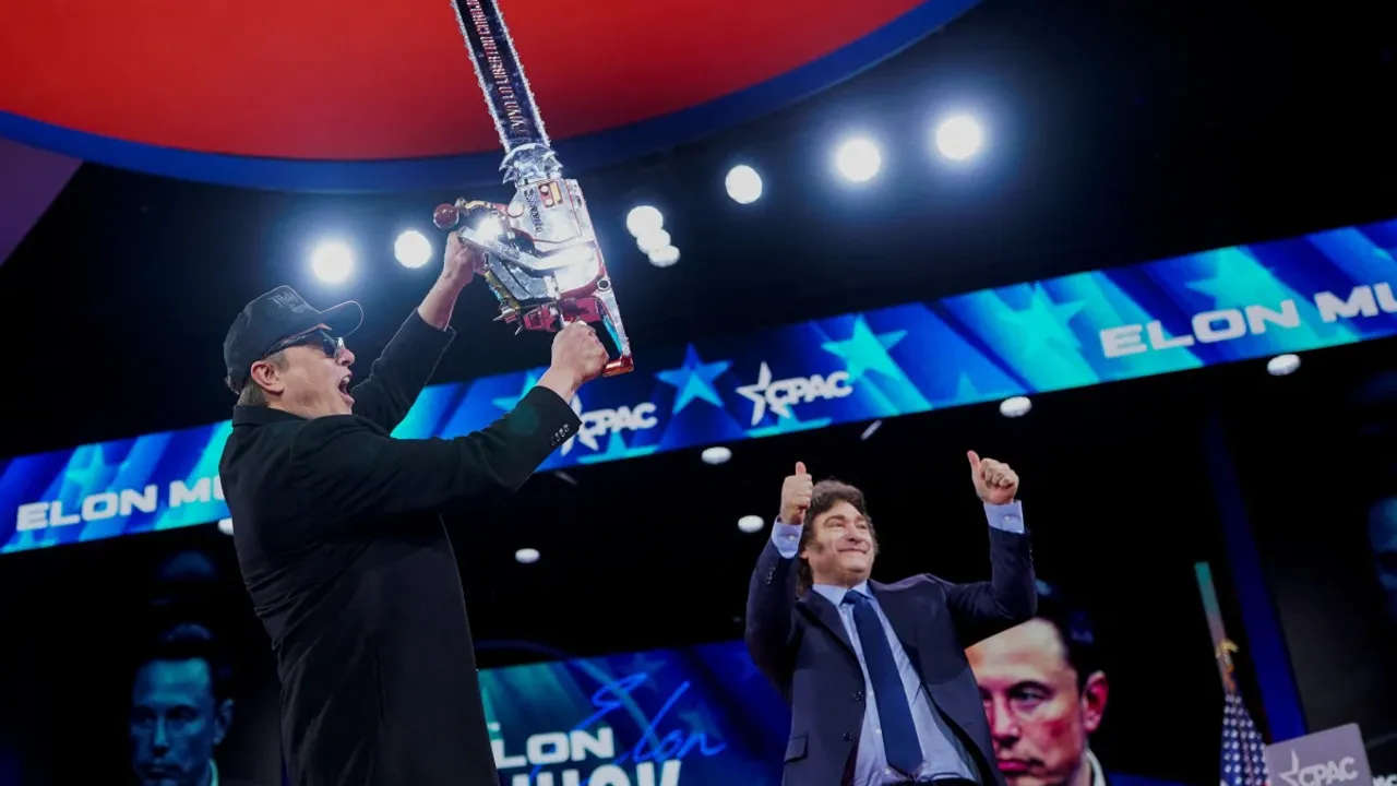 ABD’nin Washington yakınlarında düzenlenen Muhafazakar Siyasi Eylem Komitesi (CPAC) 2025 Yıllık Toplantısı’na katılan Elon Musk, Arjantin Devlet Başkanı Javier Milei’nin hediye ettiği altından yapılmış büyük bir elektrikli testere ile sahneye çıktı.