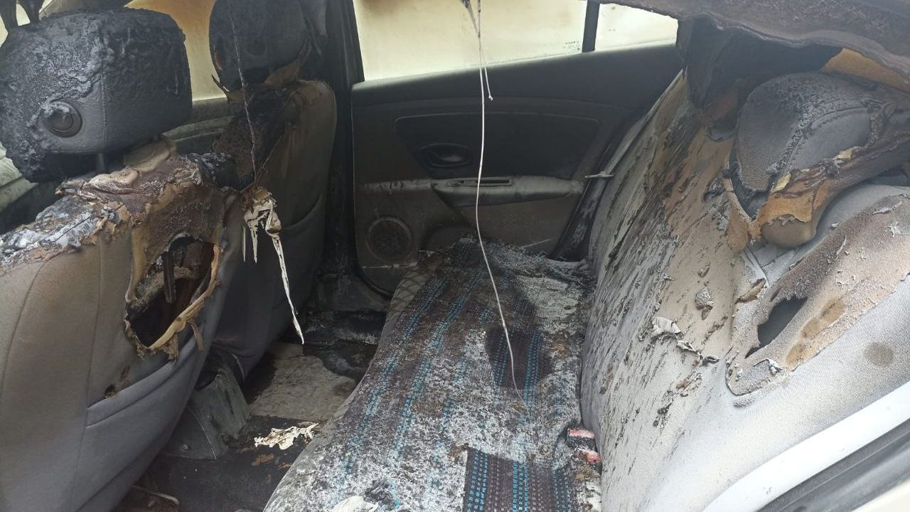 Araç alev alev yanarken şüpheli olay yerinden koşarak uzaklaştı. Alevlerin yükselmesiyle birlikte aracın lastikleri patladı. Patlama sesine uyanan Çiftçi, aracına yangın söndürme tüpüyle ilk müdahalede bulunarak 112 acil ihbar hattına haber verdi.