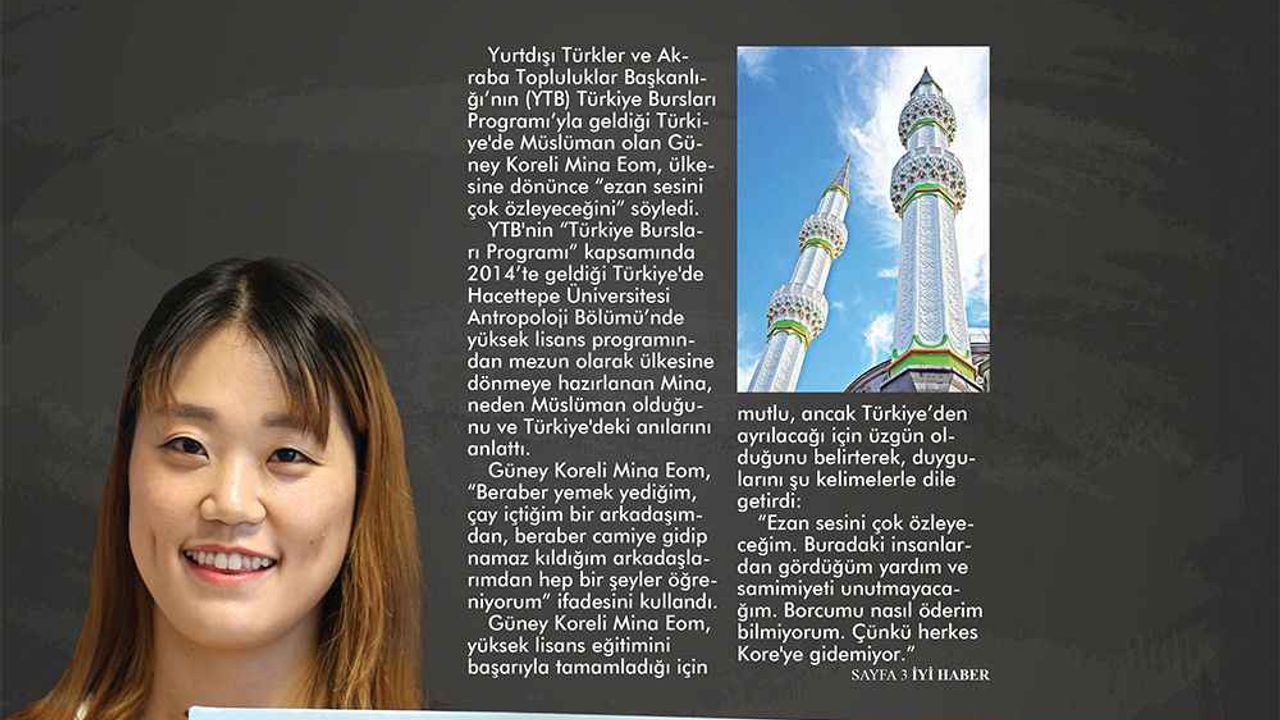 Yurtdışı Türkler ve Akraba Topluluklar Başkanlığı’nın (YTB) Türkiye Bursları Programı’yla geldiği Türkiye’de Müslüman olan Güney Koreli Mina Eom, ülkesine dönünce “ezan sesini çok özleyeceğini” söyledi.