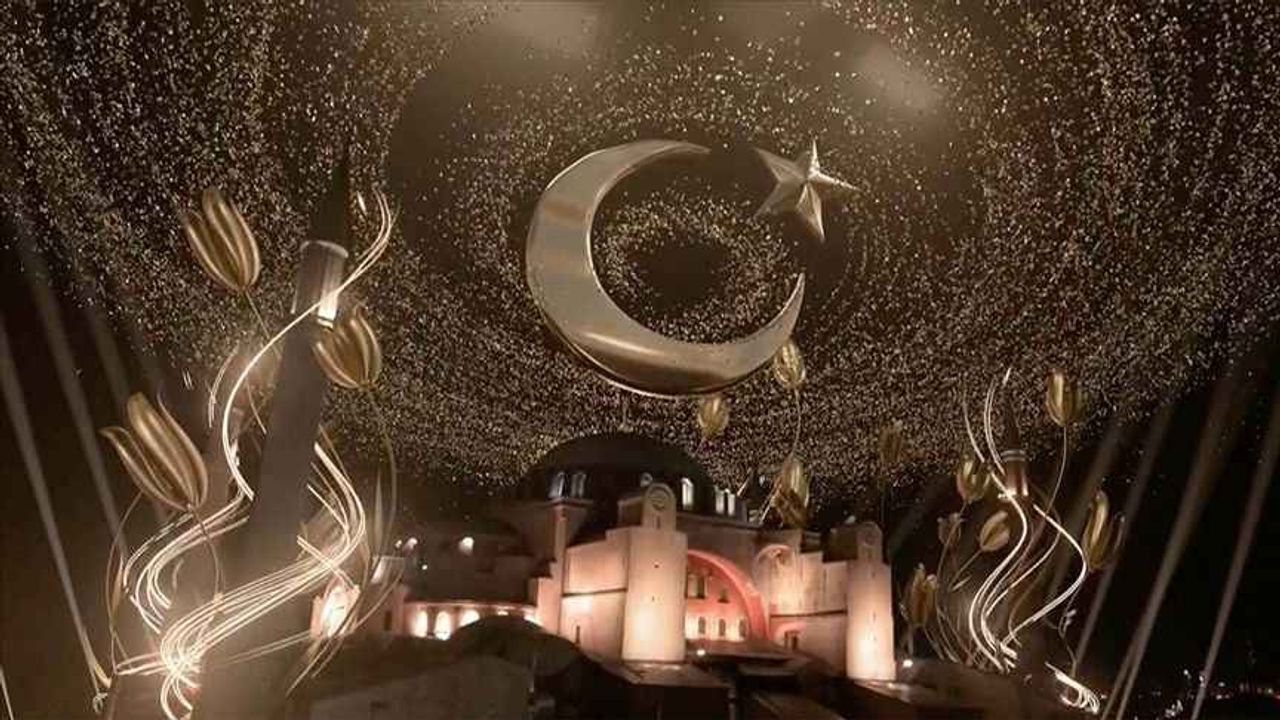 Gösterilerde, 1453'te henüz 21 yaşında İstanbul'u fethedip Osmanlı Devleti'ni üç kıtada hüküm süren dünya imparatorluğuna dönüştüren Fatih Sultan Mehmet'in at üstündeki görseli ve fethin sembolleri, gökyüzü video haritalama yöntemiyle Ayasofya-i Kebir Camii Şerifi üzerinde verildi.
