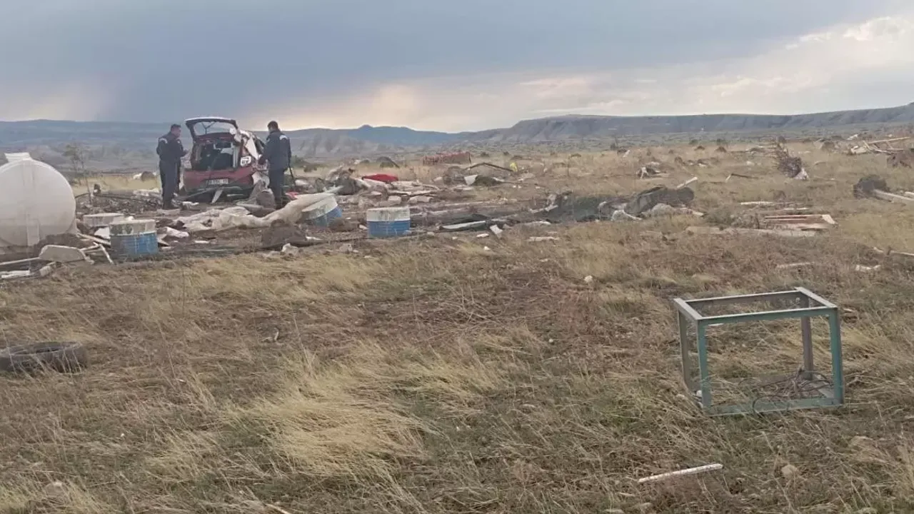 Bir süre sonra gün boyu etkili olan şiddetli rüzgarın ve hortumun etkisiyle hobi bahçesinde bulunan konteyner ev devrildi.
