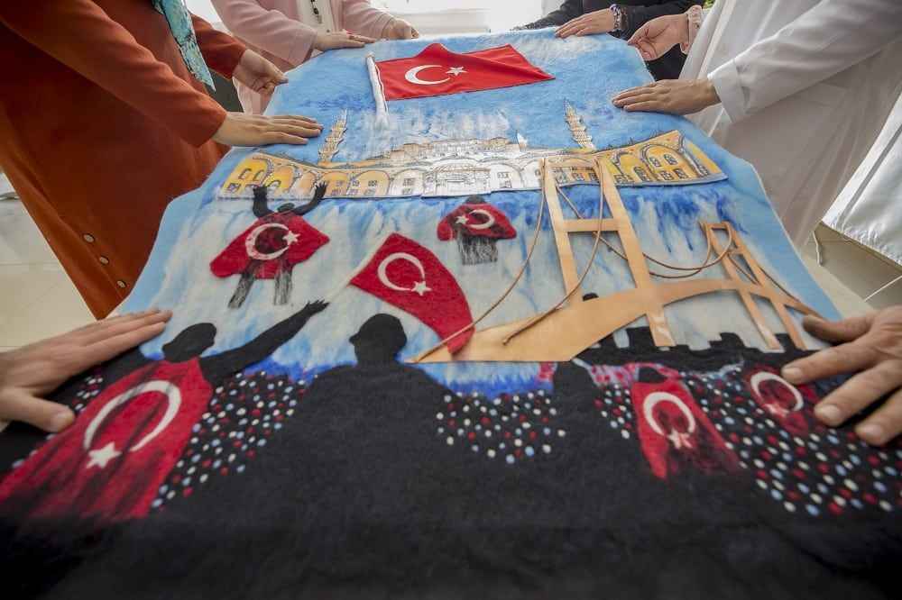 Yaklaşık 15 gün süren özenli çalışmada, 5 farklı atölyede geleneksel el sanatlarından olan nakış işleme, keçe boyama, Maraş işi, bakırcılık ve deri işleme teknikleri kullanıldı. İkiz olarak tamamlanan tablolarda, sokaklarda ellerinde bayraklarla mücadele eden kahramanların yanı sıra 15 Temmuz Şehitler Köprüsü, Sultan Ahmet Camisi ve Türk bayrağı motifleri işlendi.