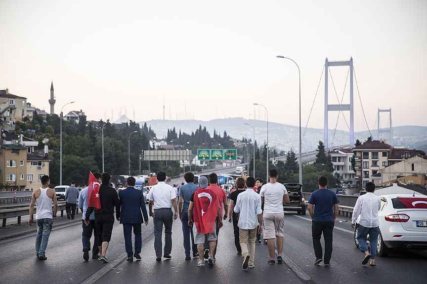 Buna karşın Cumhurbaşkanı Erdoğan'ın çağrısı üzerine binlerce kişi Boğaziçi Köprüsü'ne adeta akın etti. Bazı darbeci askerler, köprüyü geçmeye çalışan vatandaşların üzerine ateş açtı. Tankın da kullanıldığı saldırılarda aralarında polis memurları Münür Alkan, Kemal Tosun, reklamcı Erol Olçok, 16 yaşındaki oğlu Abdullah Tayyip Olçok'un da bulunduğu 34 kişi şehit oldu. Halkın direncini kıramayan askerler, sabaha karşı teslim olmak zorunda kaldı.