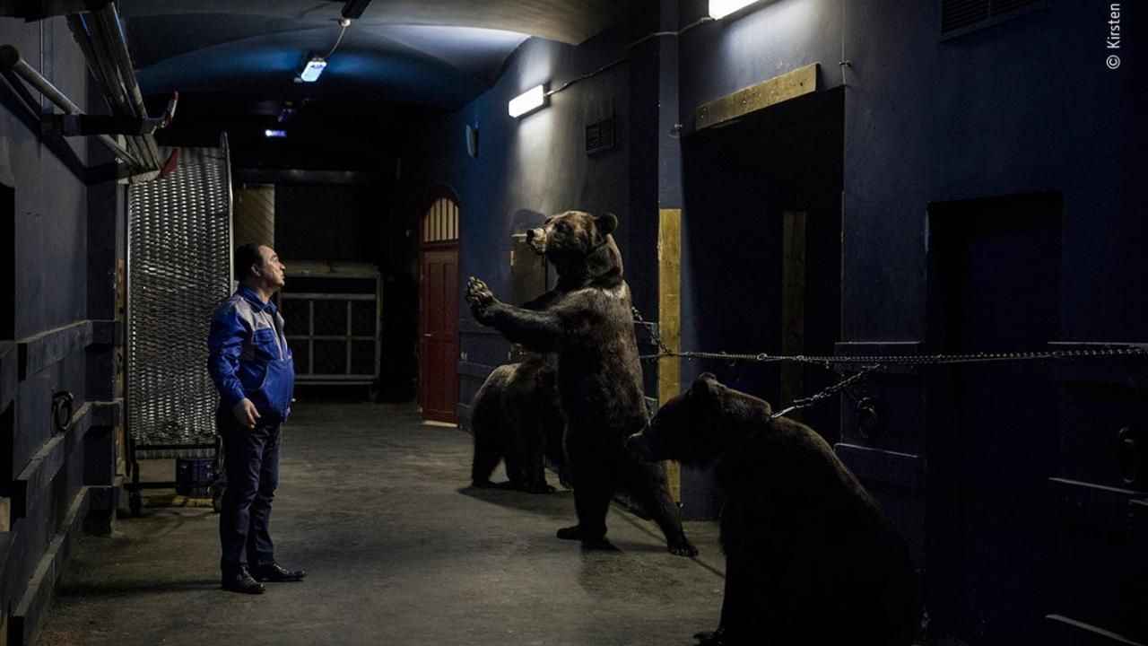 Kahverengi sibirya ayıları, terbiyecilerinin yanında.