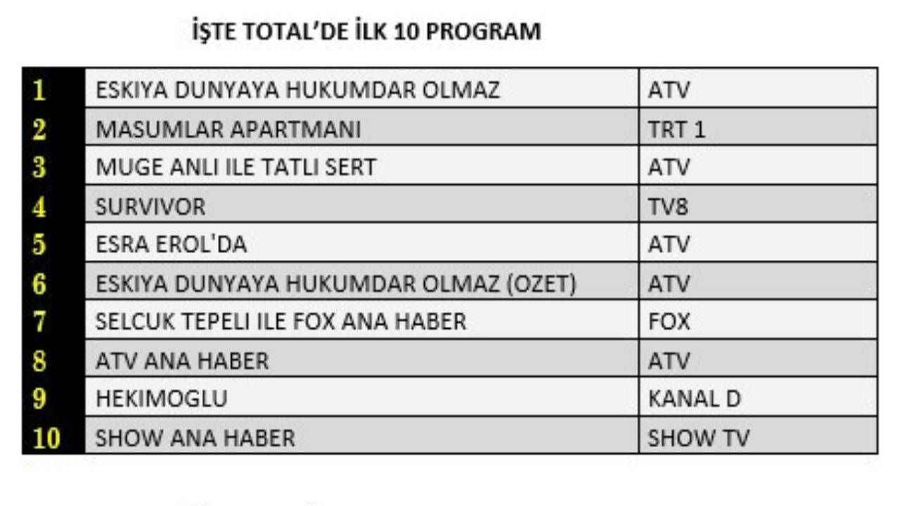 Total'de 1.sırada ATV’de ekrana gelen “Eşkıya Dünyaya Hükümdar Olmaz”, 2. sırada TRT1’de yayınlanan “Masumlar Apartmanı”, 3.sırada ATV’de izleyiciyle buluşan “Müge Anlı İle Tatlı Sert” programı yer aldı.