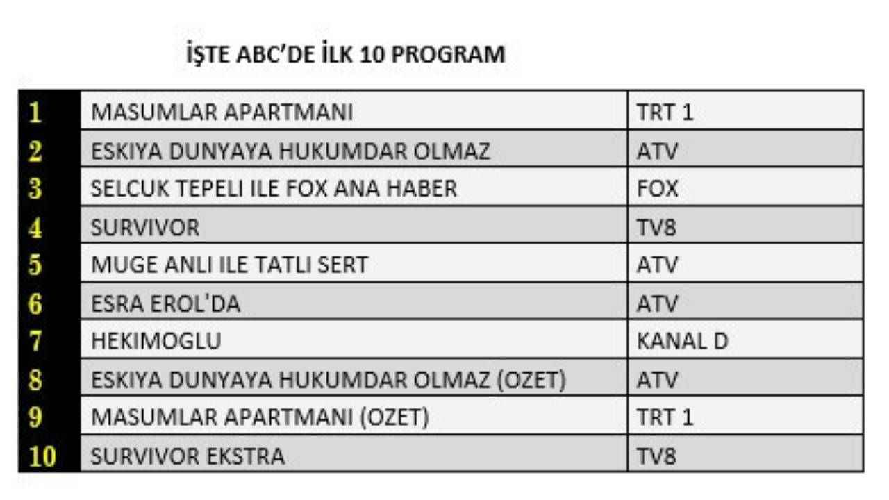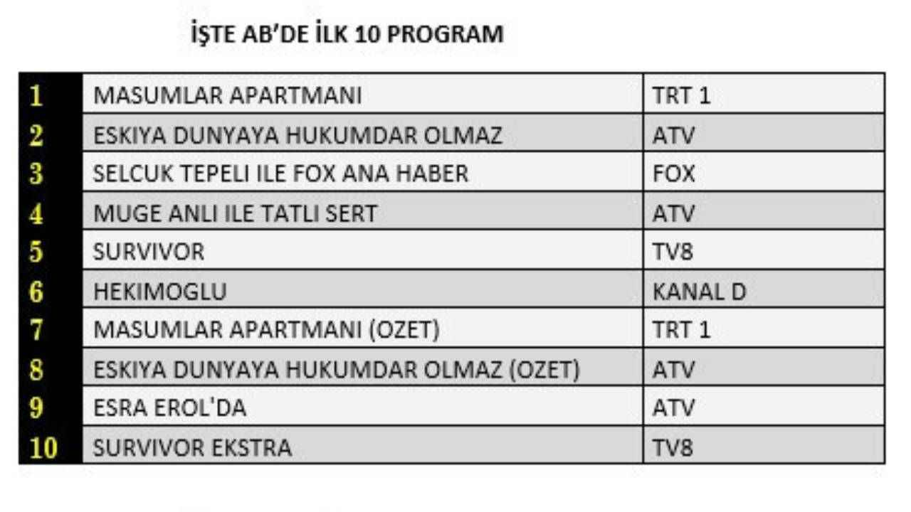 AB'de ise 1.sırada “Masumlar Apartmanı”, 2.sırada “Eşkıya Dünyaya Hükümdar Olmaz”, 3.sırada “Selçuk Tepeli İle Fox Ana Haber” yer aldı.