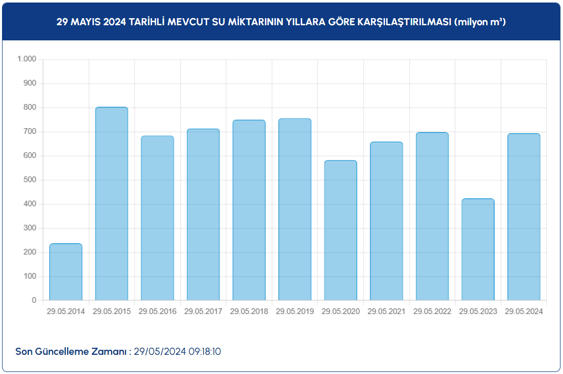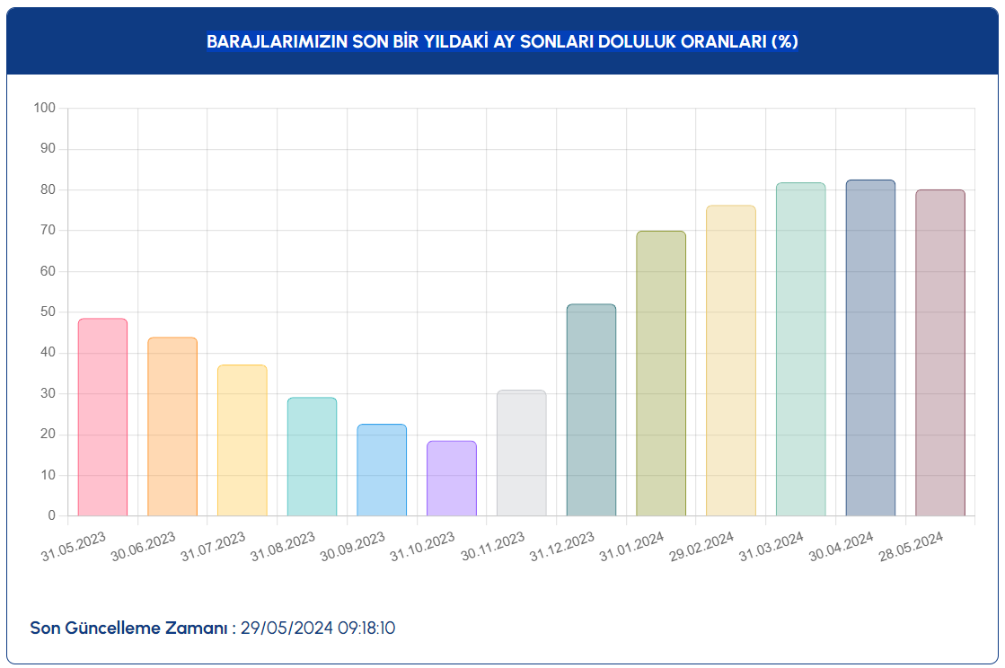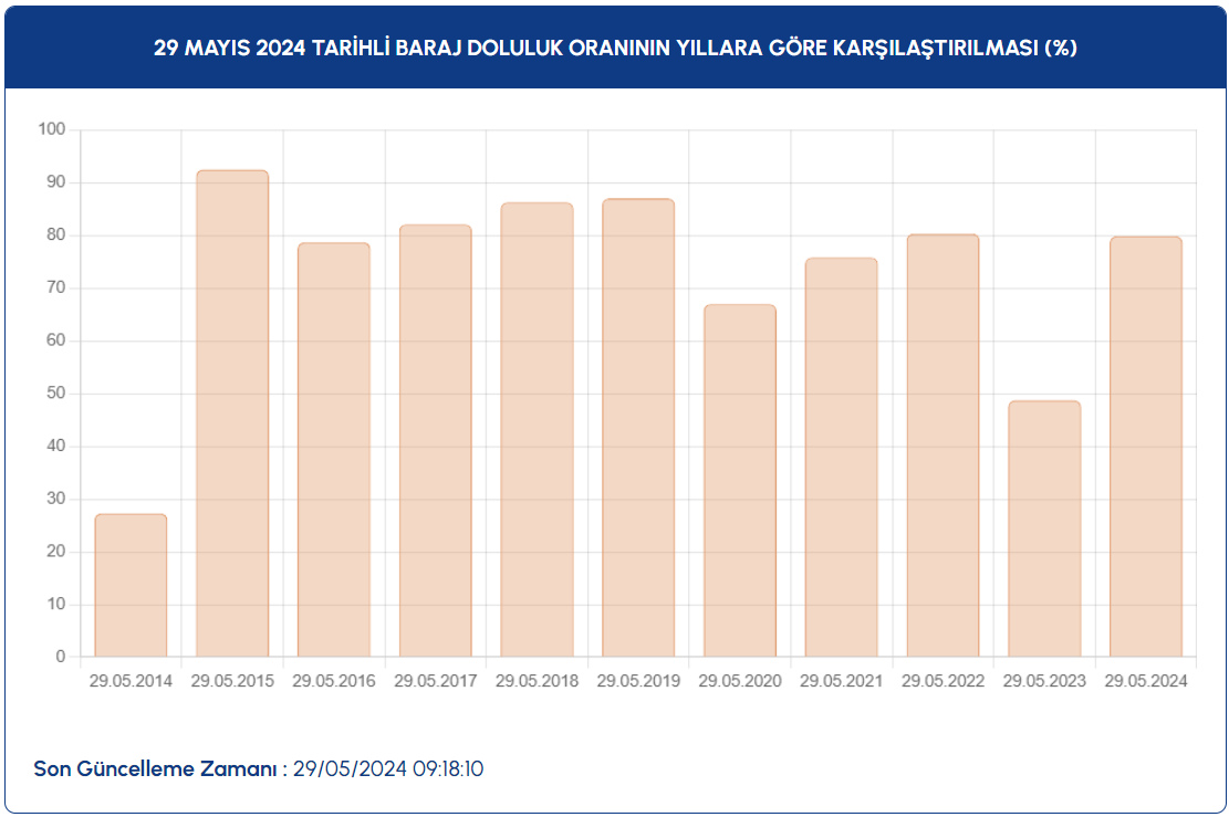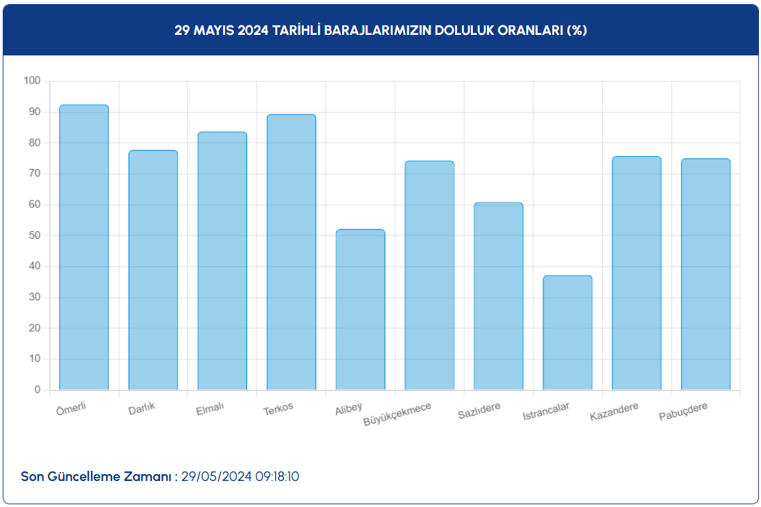 Havanın mevsim normallerinde seyretmesiyle vatandaşlar merak etmeye başladı. Türkiye'nin en kalabalık şehri İstanbul'un baraj doluluk oranı günün en çok merak edilen konusu oldu. İstanbul Su ve Kanalizasyon İdaresi (İSKİ) 29 Mayıs 2024 baraj doluluk oranlarını yayınladı. İSKİ ortalama baraj doluluk oranı yüzde 79.92 olarak açıkladı.