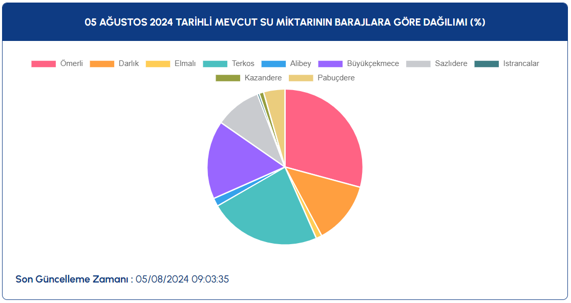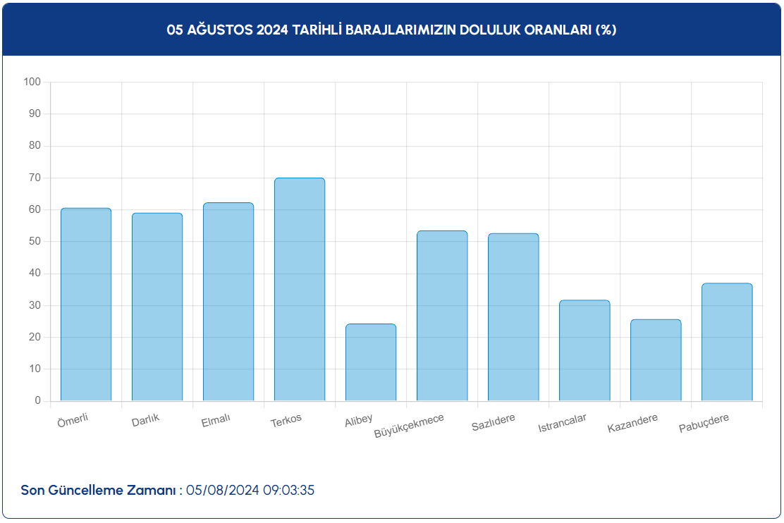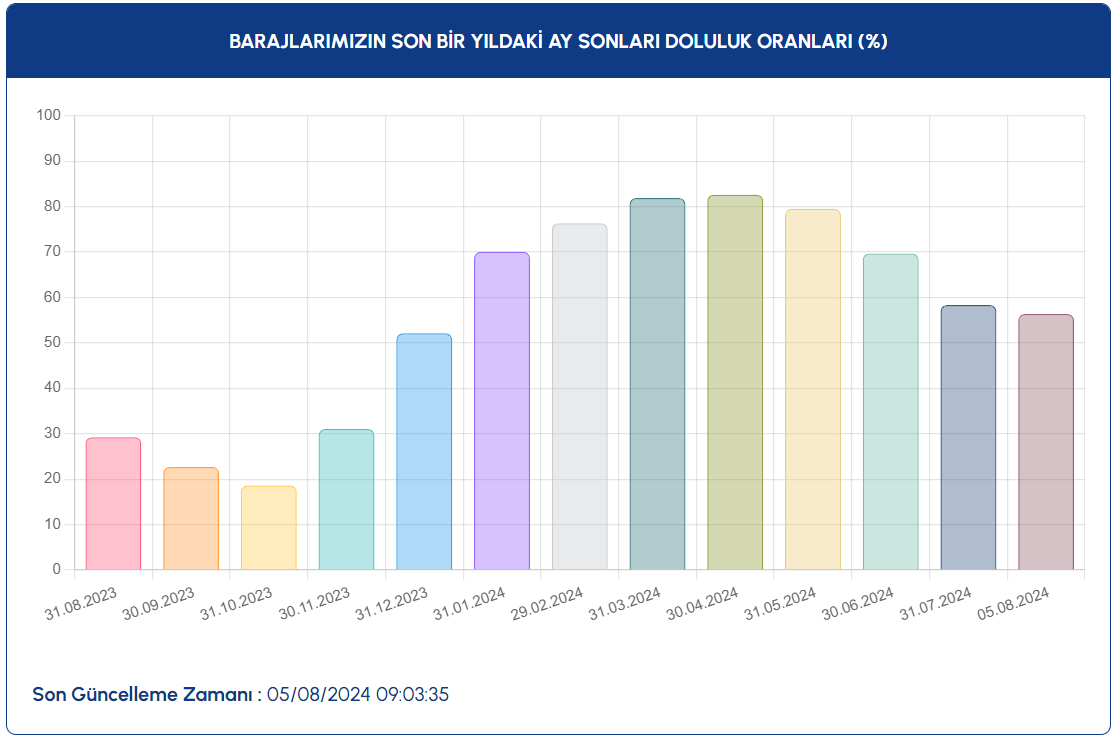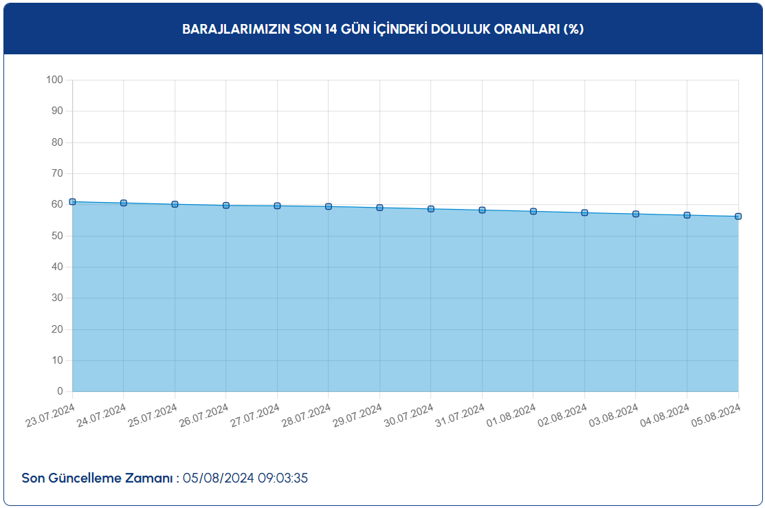 5 Ağustos tarihi itibarıyla İSKİ ortalama baraj doluluk oranı yüzde 56.34 oldu.