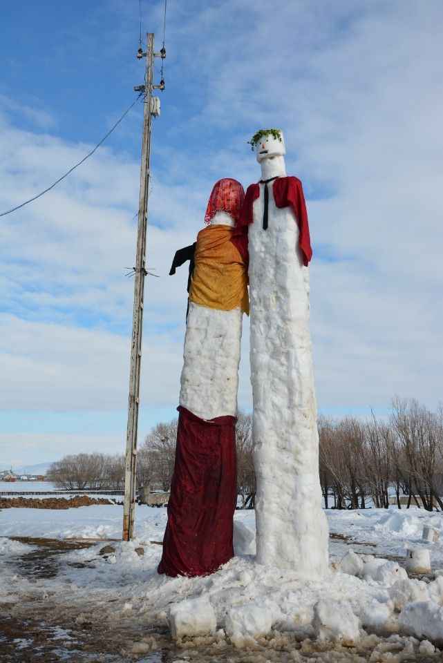 İmamoğlu kardeşler, kürek ve kova kullanarak 3 günde 5 metre uzunluğunda kardan gelin ve damat yaptı.