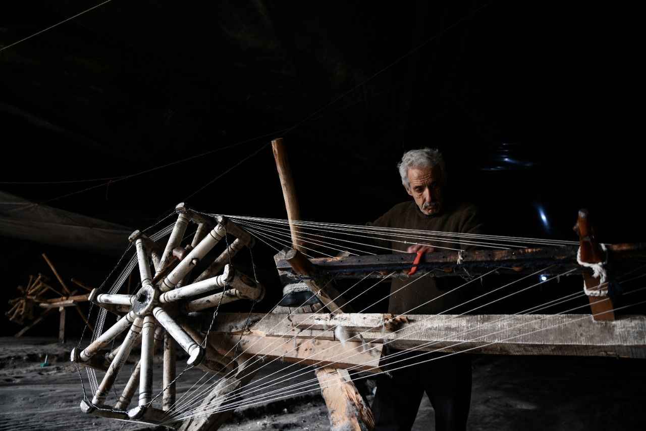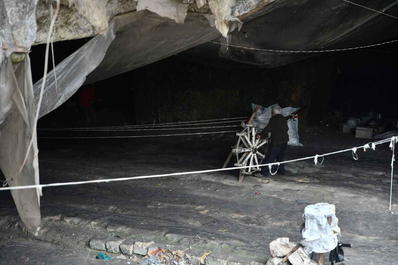Mehmet Ali Macık, mağaraya getirdiği fabrika atığı malzemeleri, ahşaptan yapılan silindir şeklindeki çıkrığa sarıyor. Tezgahı elle çevirerek iplik haline getirdiği ürünü, tezgahlar arasında yürüyerek topluyor.