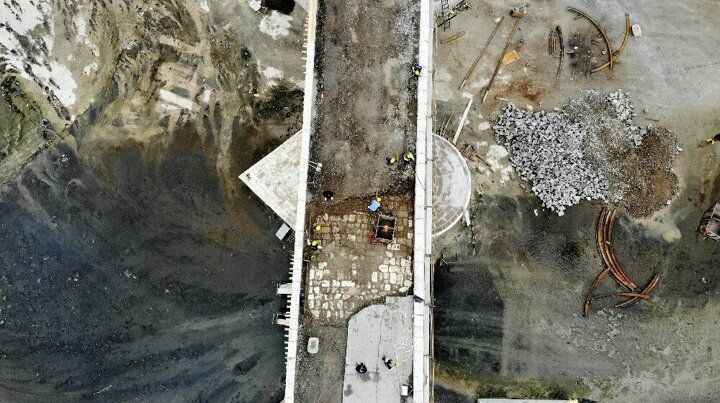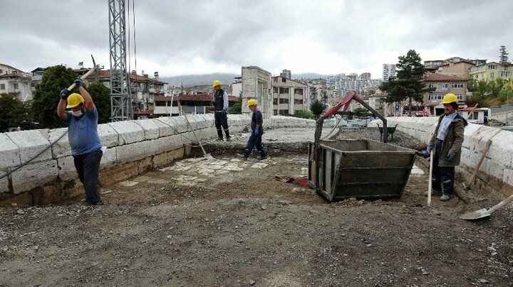 Hafriyat ise vinç vasıtası ile köprüden alınarak boşaltılıyor. Yaklaşık 2 aydır devam eden çalışmalarda köprünün zeminindeki asfalt malzeme kaldırılarak 770 yıllık taşlar yeninden ortaya çıkartıldı.