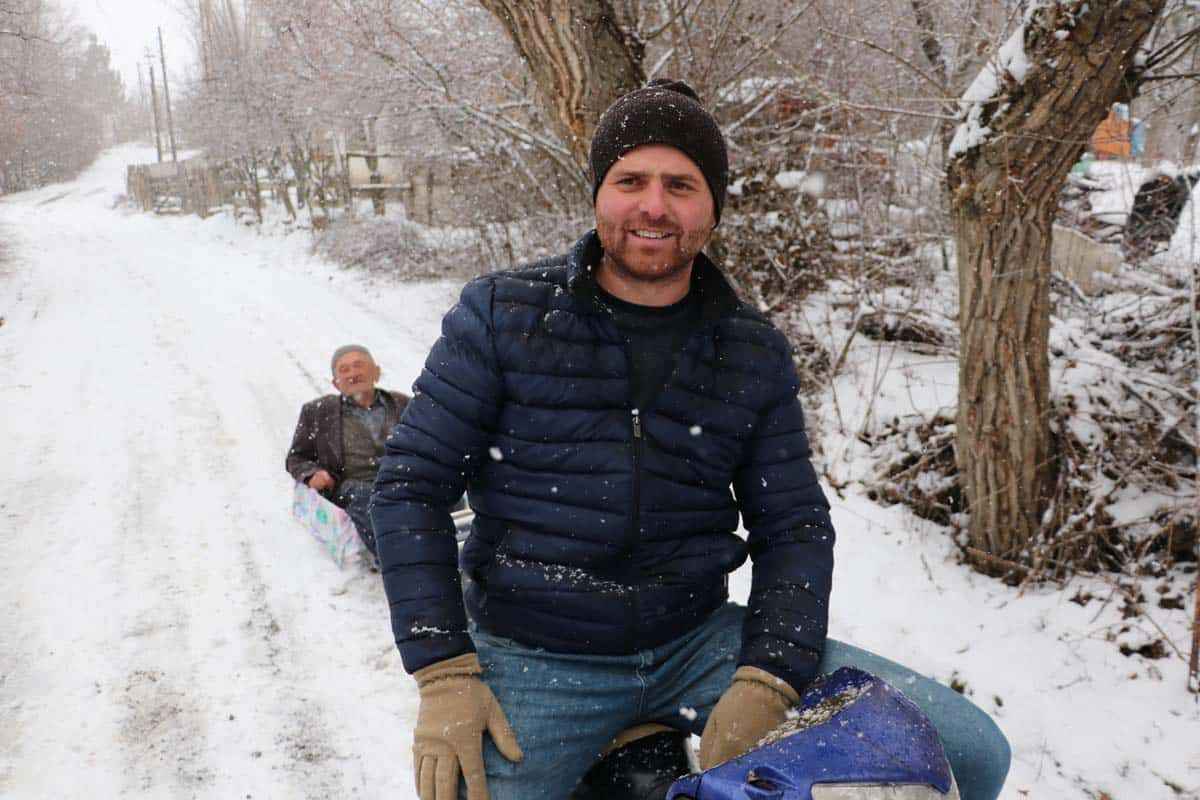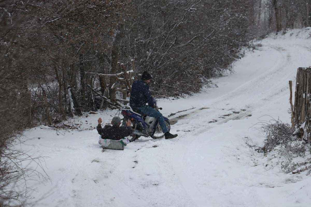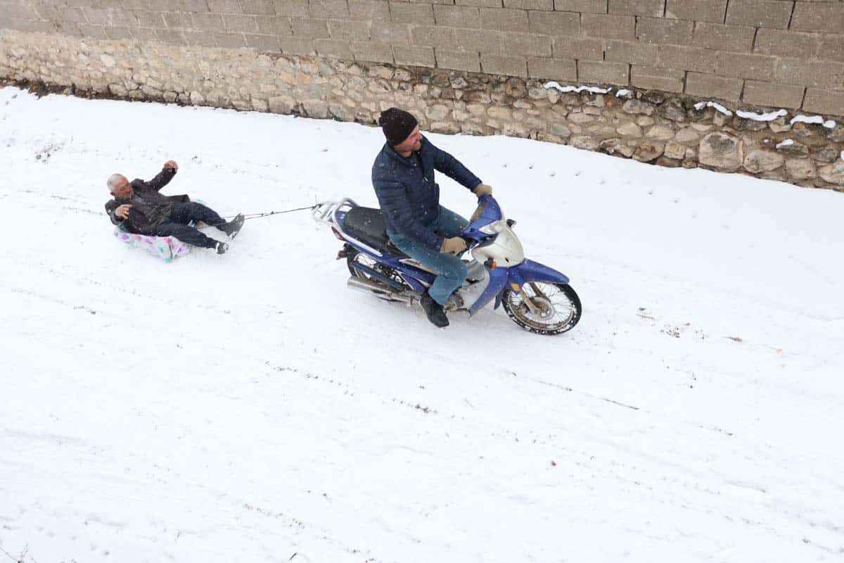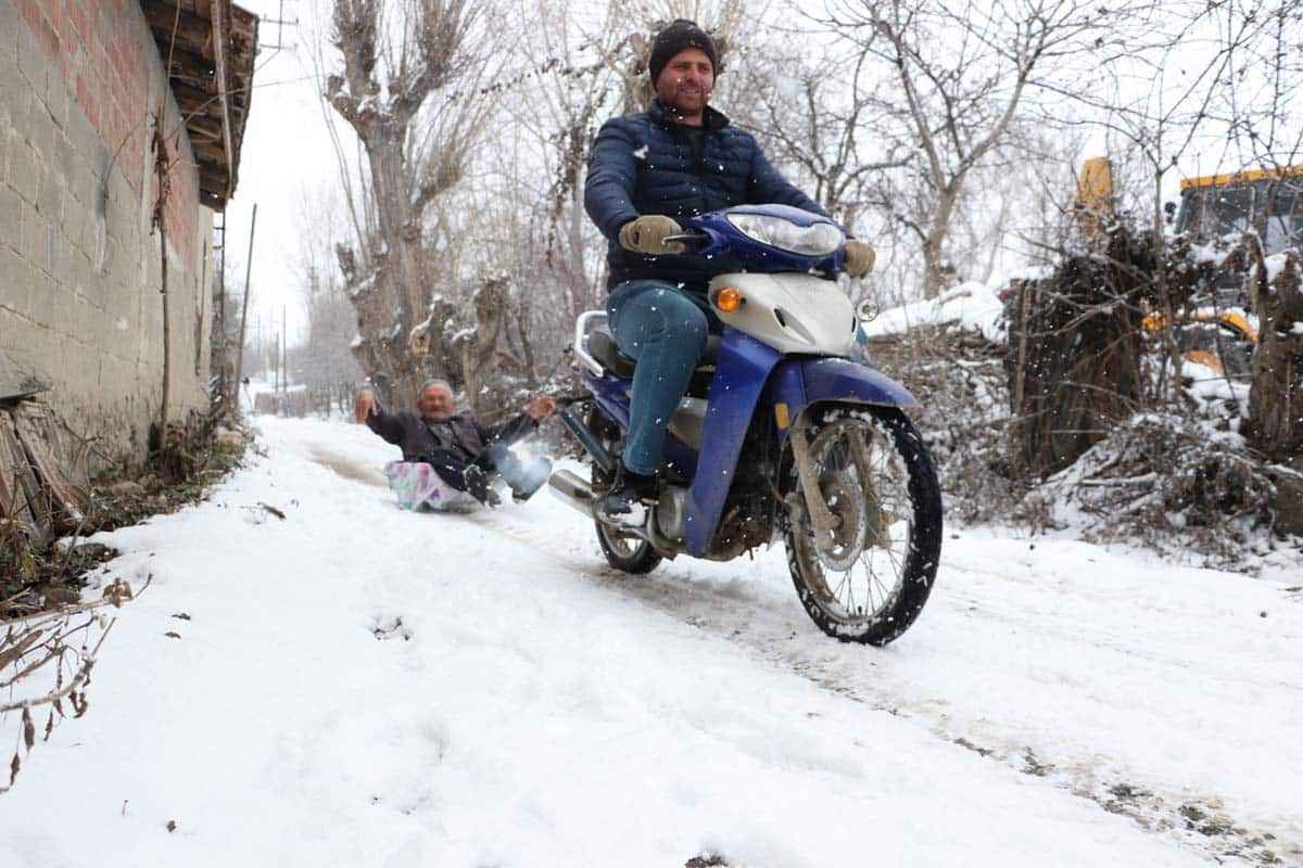 Kent merkezine bağlı Gökçekent köyünün Varsak Mahallesi'nde yaşayan Mehmet Zaim'in komşusu Hakkı Zaim, kar yağışının ardından 3 yaşındaki çocuğu için, el arabasının teknesini iple motosikletine bağladı.