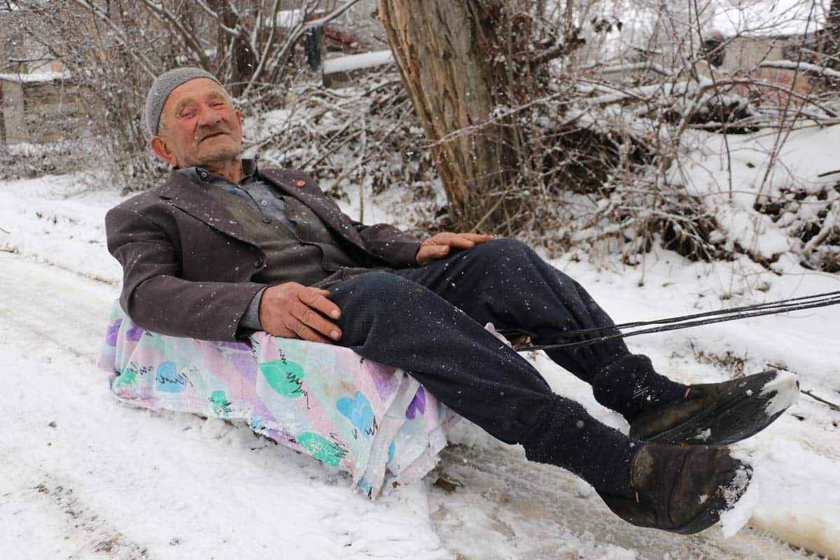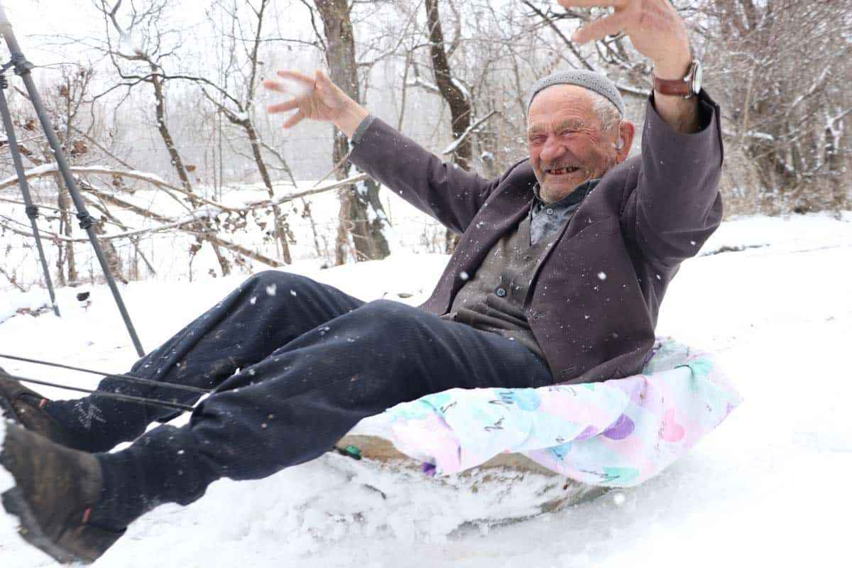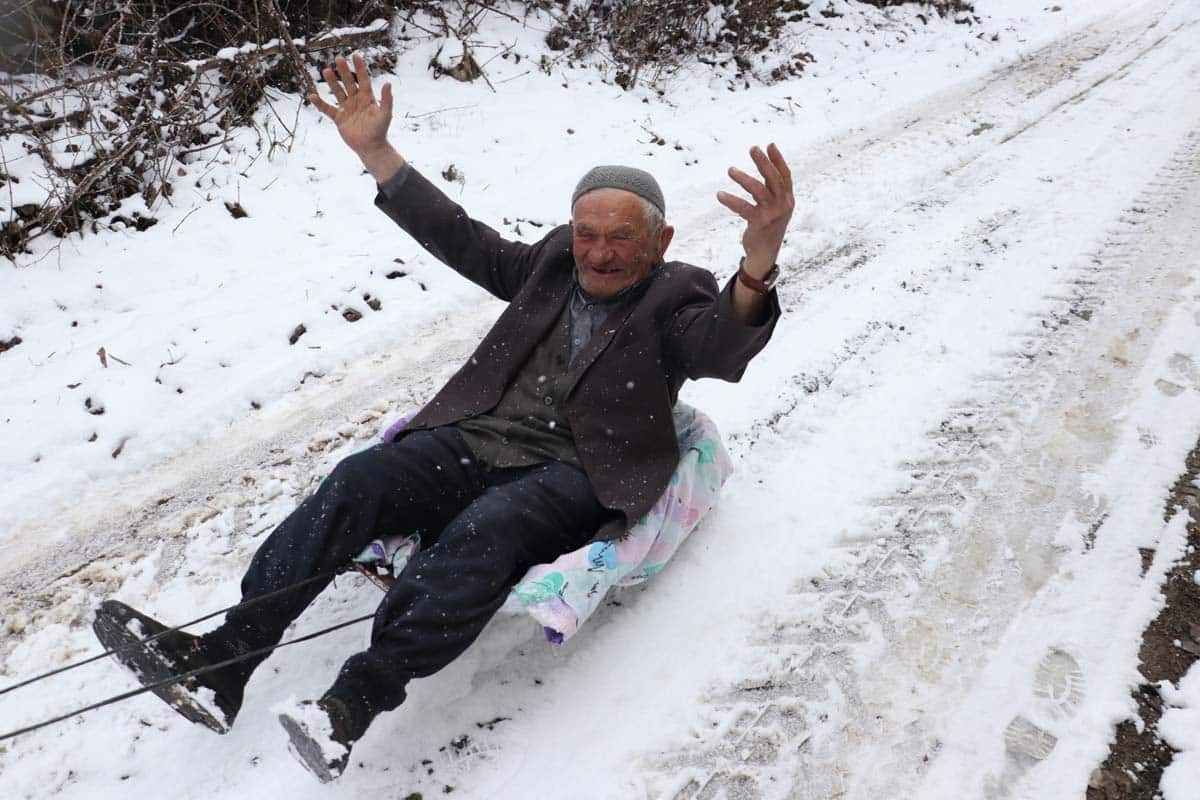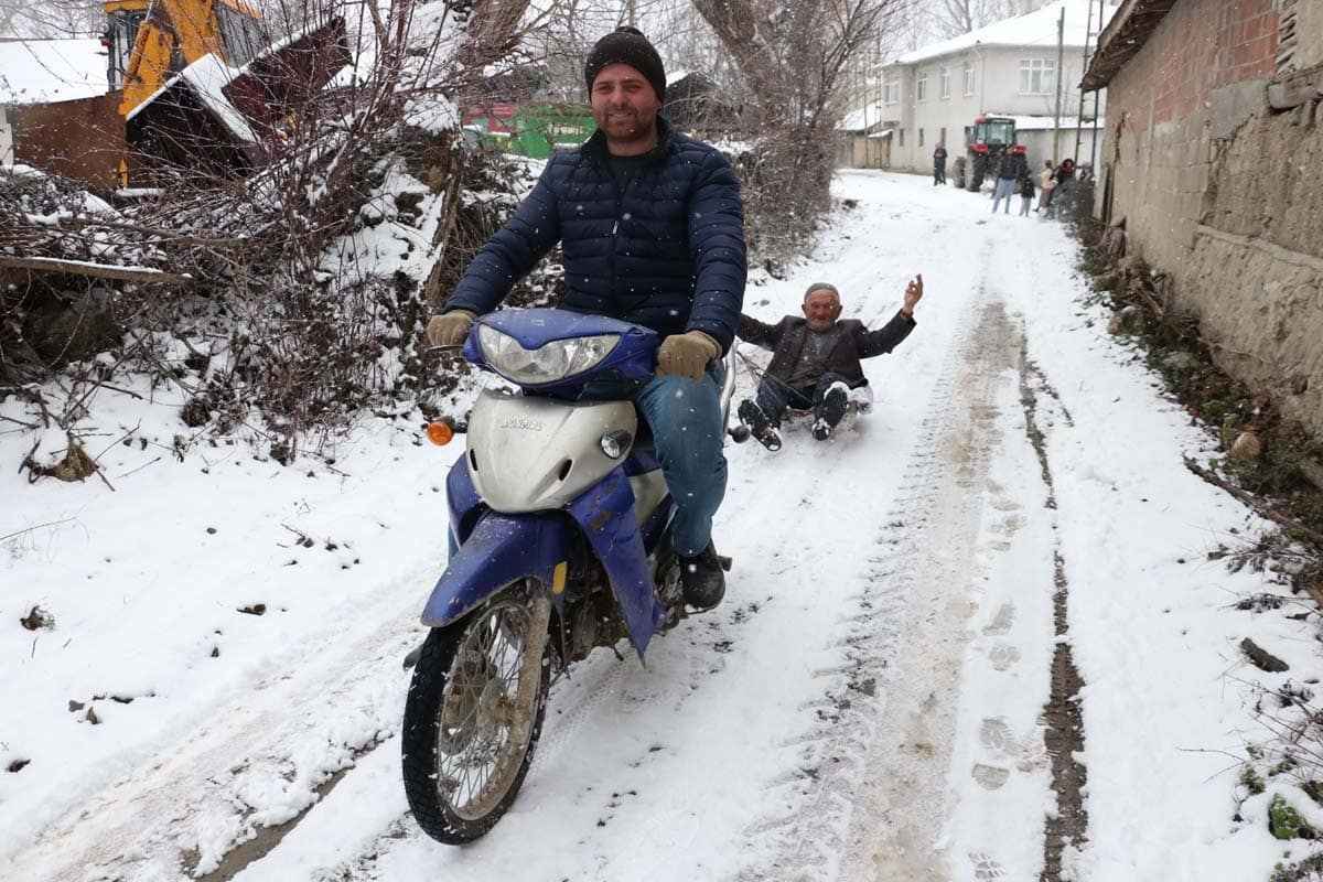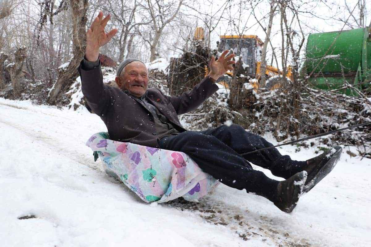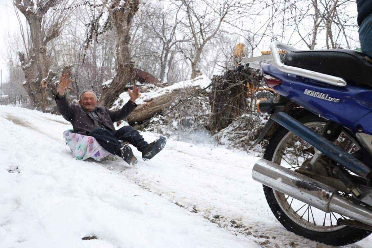 Komşusunun, köyün içinde çocuğunu kaydırdığını gören Mehmet Zaim de kızağa binmek istediğini söyledi.