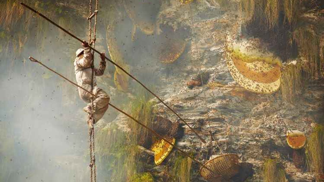 Nepal'in yüksek dağlarından olan Nakal Gurung dağının keskin yamaçlarına petek yapan arıların balını almak o kadar da kolay değil...