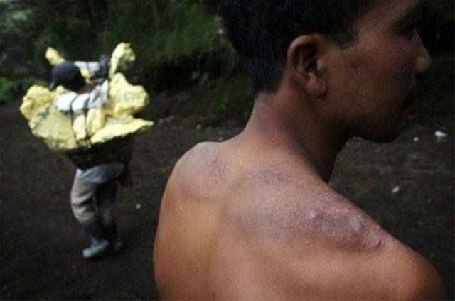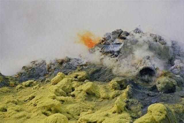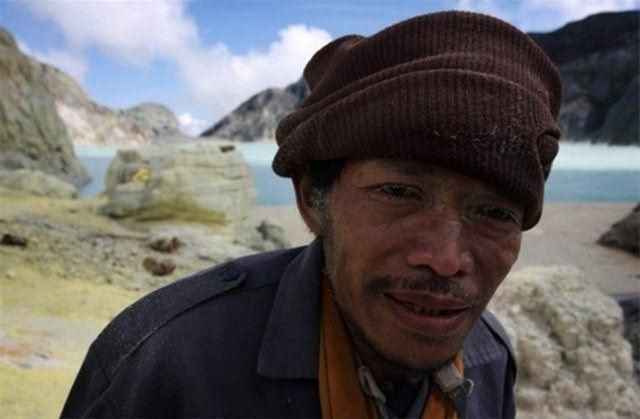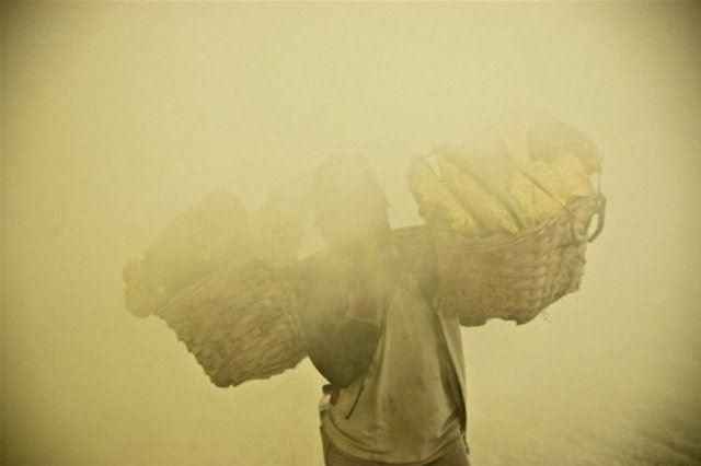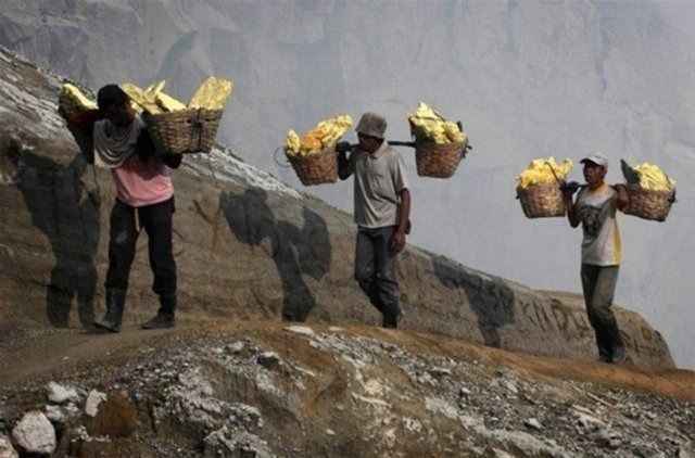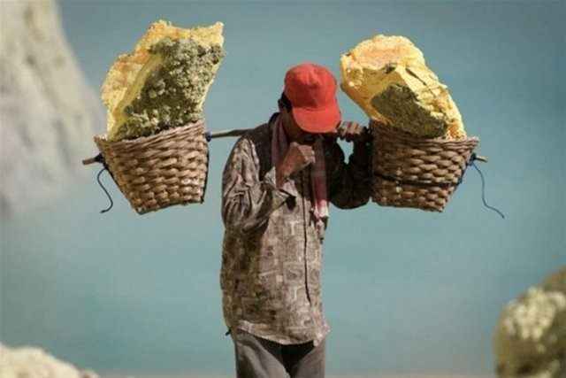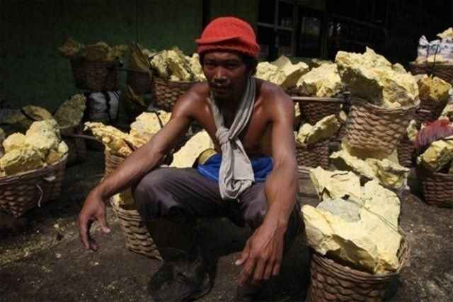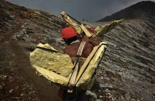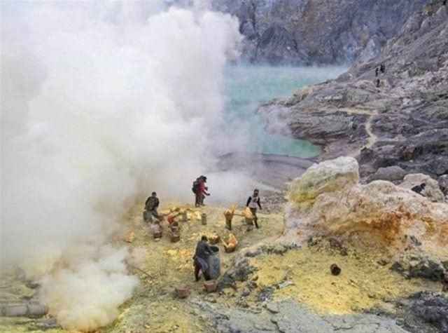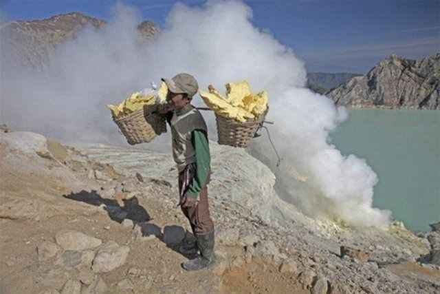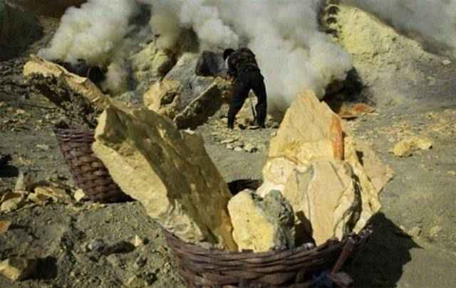 Bu aktif yanardağ ağzına varillerle kanallar döşenip erimiş sülfürler bir yerde toplanıyor ve oradan alınan sülfürler soğutulup kırılarak bambu sepetlere doldurulup köye taşınıyor.