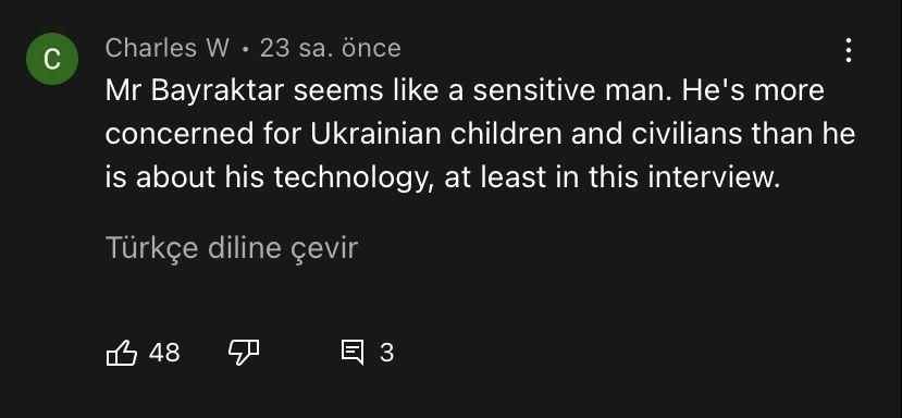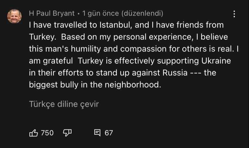 İstanbul’a seyahat ettim ve Türkiye’den arkadaşlarım var. Kişisel deneyimime dayanarak, bu adamın başkalarına karşı alçakgönüllülüğünün ve şefkatinin gerçek olduğuna inanıyorum. Türkiye bölgedeki en büyük kabadayı olan Rusya’ya karşı koyma çabalarında Ukrayna’yı etkin bir şekilde desteklediği için minnettarım.