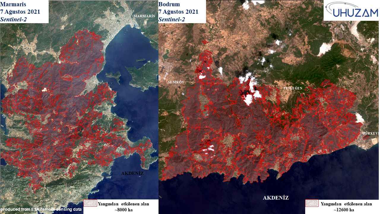 Yüksek çözünürlüklü uydu görüntülerinde, yangınların 28 Temmuz'da başladığı, 9 Ağustos'a kadar yoğun şekilde sürdüğü ve bazı bölgelerde hala yangınların devam ettiği belirlendi.