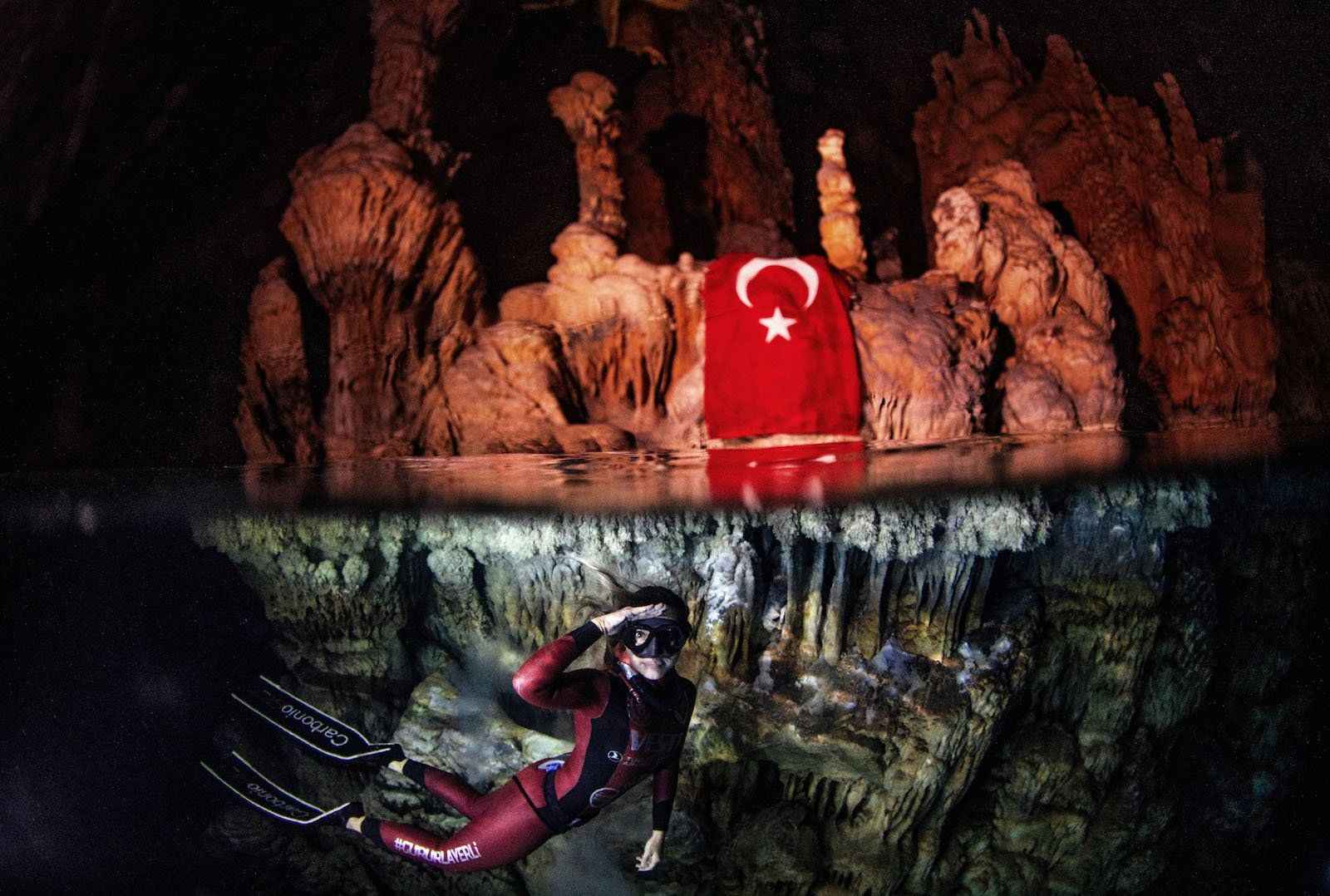 Şahika Ercümen, Mersin'deki Gilindire Mağarası'nda, Sanayi ve Teknoloji Bakanlığı İle Çukurova Kalkınma Ajansının desteklediği dalışta, paletsiz kategoride 90 metre sınırını aşarak kadınlar dünya rekorunu kırdı. Şahika Ercümen antrenman dalışı sırasında görülüyor.