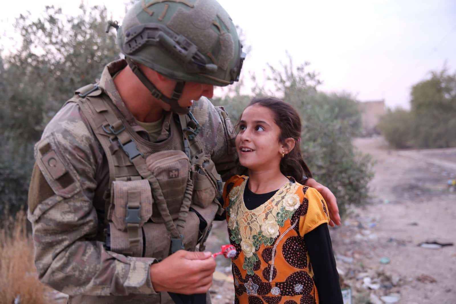 Mehmetçik, Suriye'nin kuzeyinde Barış Pınarı Harekatı ile kontrol altına alınan yerleşim birimlerinde savaş mağduru çocukların yüzünü güldürüyor. YPGPKK işgalinden kurtarılan Tel Halaf halkına yardım elini uzatan Mehmetçik, ekmek ve gıda dağıtımı yapılan köyde çocukları çikolata ve şekerle sevindirdi.