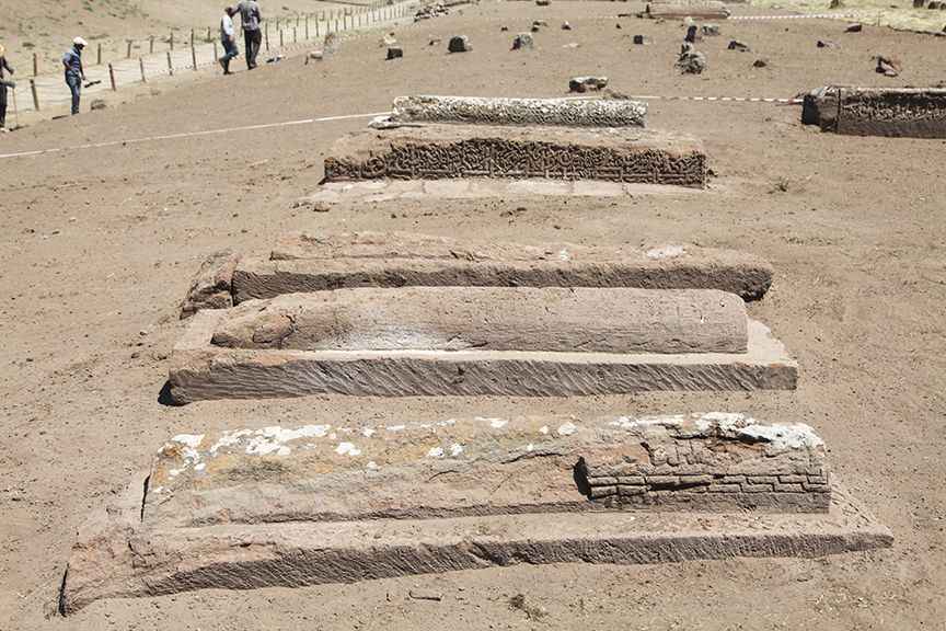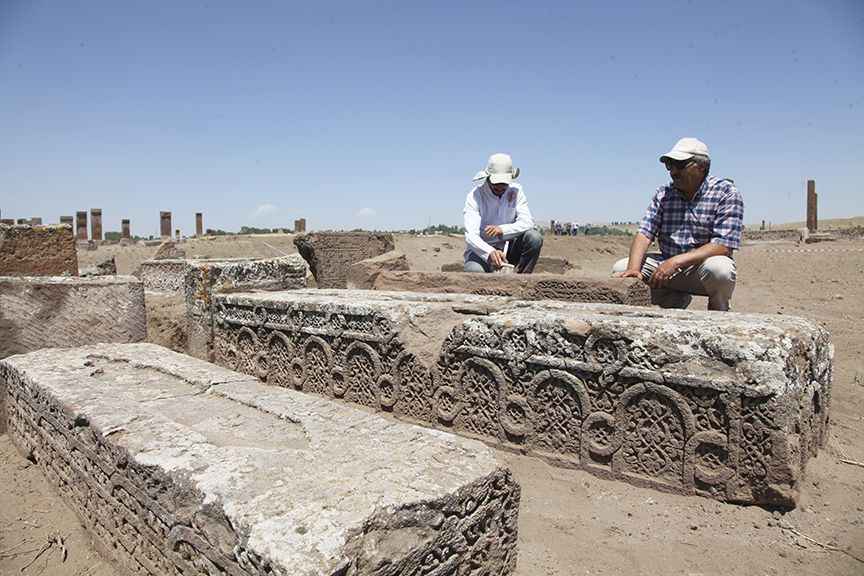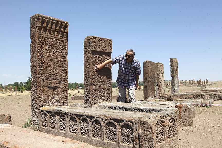 "Parçaları tespit edilerek bütünlüğü sağlanan şahideleri restore ederek yeniden özgün konumlarında ayağa kaldırıyoruz ancak kaybolan şahideleri bulmak mümkün değil. Bu sene inşallah Sayın Cumhurbaşkanımızın gelişine kadar Rus işgali sırasında mezarlık içinde tahrip olan ve bir dere yatağını andıran kısmın ıslah çalışmasında önemli bir aşamaya varmış olacağız. Yüzey toprağı alınırken sadece mezarlara rastlamadık, aynı zamanda çeşitli buluntu ve mimari yapıları da ortaya çıkardık. Müze girişi tarafında silindirik gövdeye sahip bir yapı var. Bu yapının da rölevesi ve planları çiziliyor. Kazısı tam bittikten sonra işlevleri konusunda daha net konuşma imkanımız olacak."