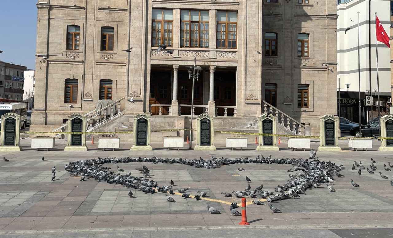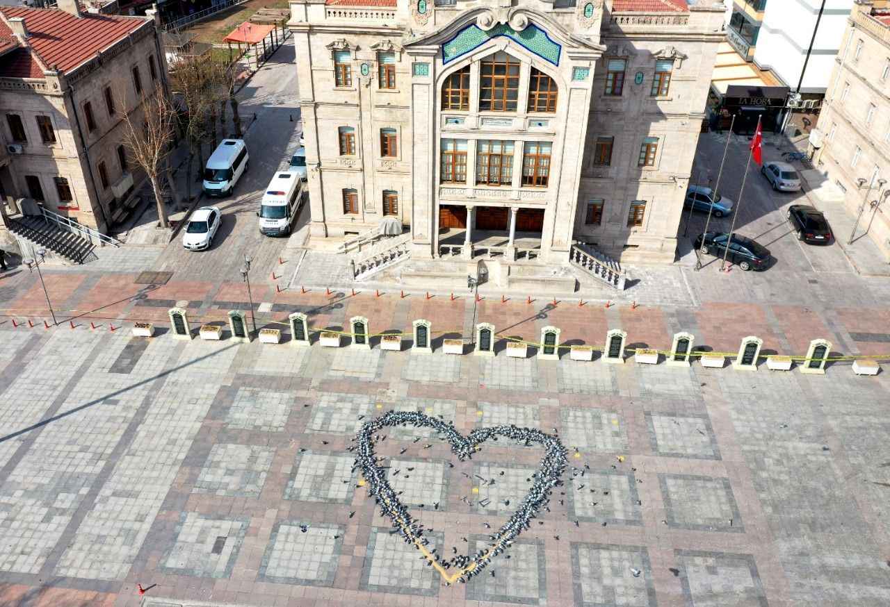 Yeni tip koronavirüs (Kovid-19) tedbirleri kapsamında sokağa çıkma kısıtlaması uygulanan Aksaray'da, 15 Temmuz Milli İrade Meydanı'nda belediye görevlilerinin bıraktığı yemlerle beslenmeye çalışan güvercinler, kalp görüntüsü oluşturdu.