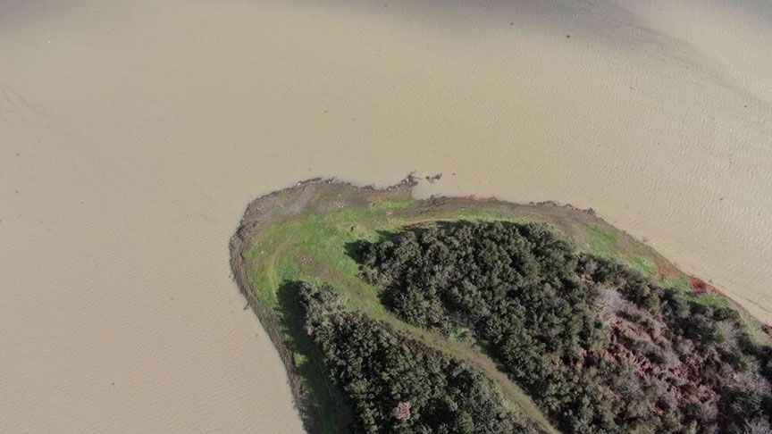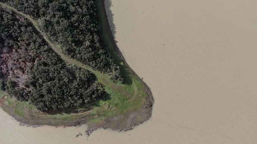 Havadan görüntülenen Alibeyköy Barajı'nda daha önceden koyun ve keçilerin otlamaya başlayan alanlar yeniden suyla dolmaya başladı.