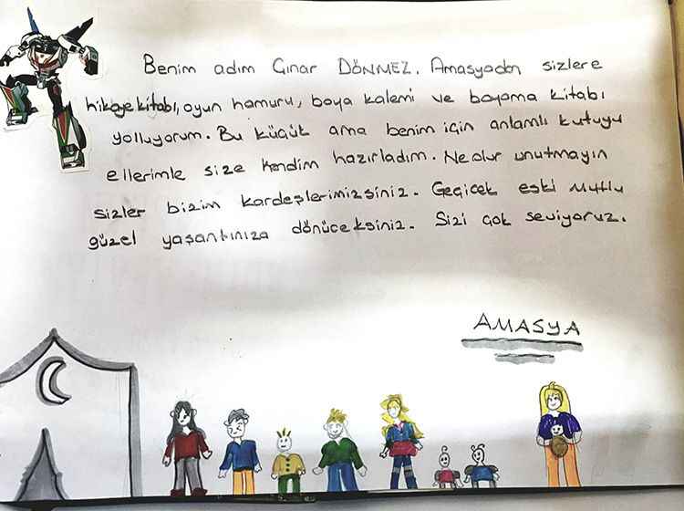 Çınar Dönmez ise "Amasya'dan sizlere hikaye kitabı, oyun hamuru, boya kalemi ve boyama kitabı yolluyorum. Bu küçük ama benim için anlamlı kutuyu ellerimle size kendim hazırladım. Ne olur unutmayın. Sizler benim kardeşlerimsiniz. Geçecek, eski mutlu, güzel yaşantınıza döneceksiniz. Sizi çok seviyoruz." notunu yazdı.