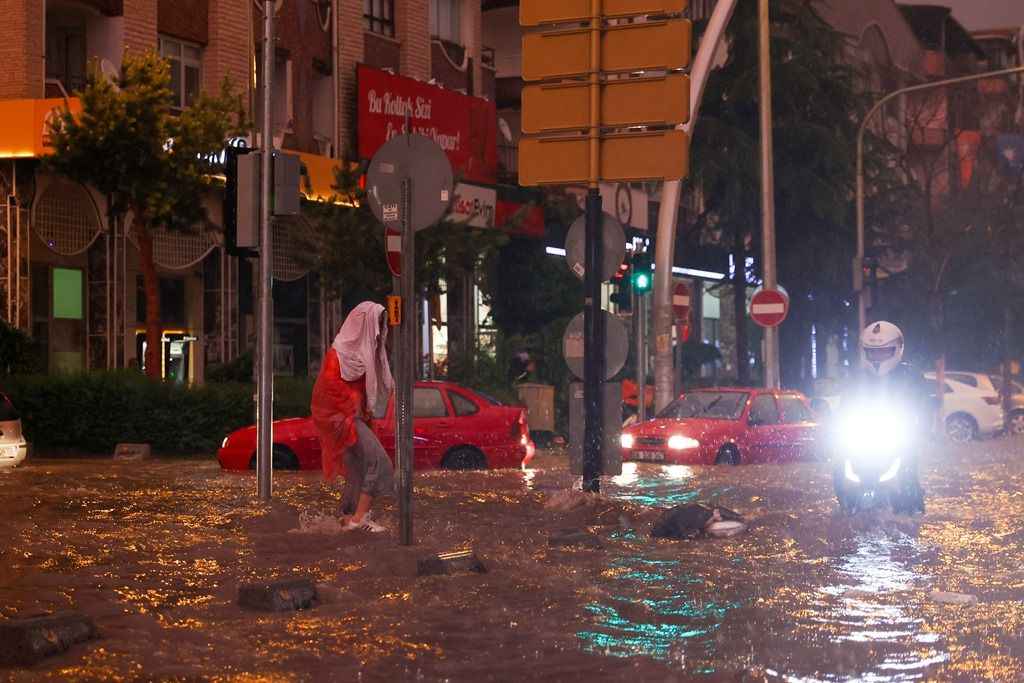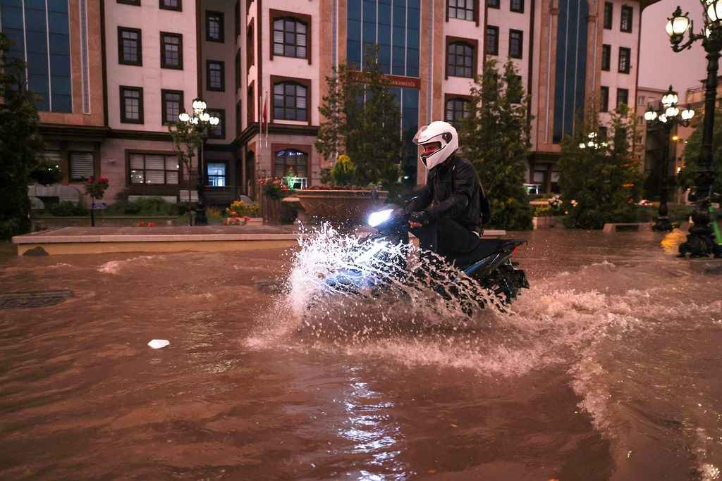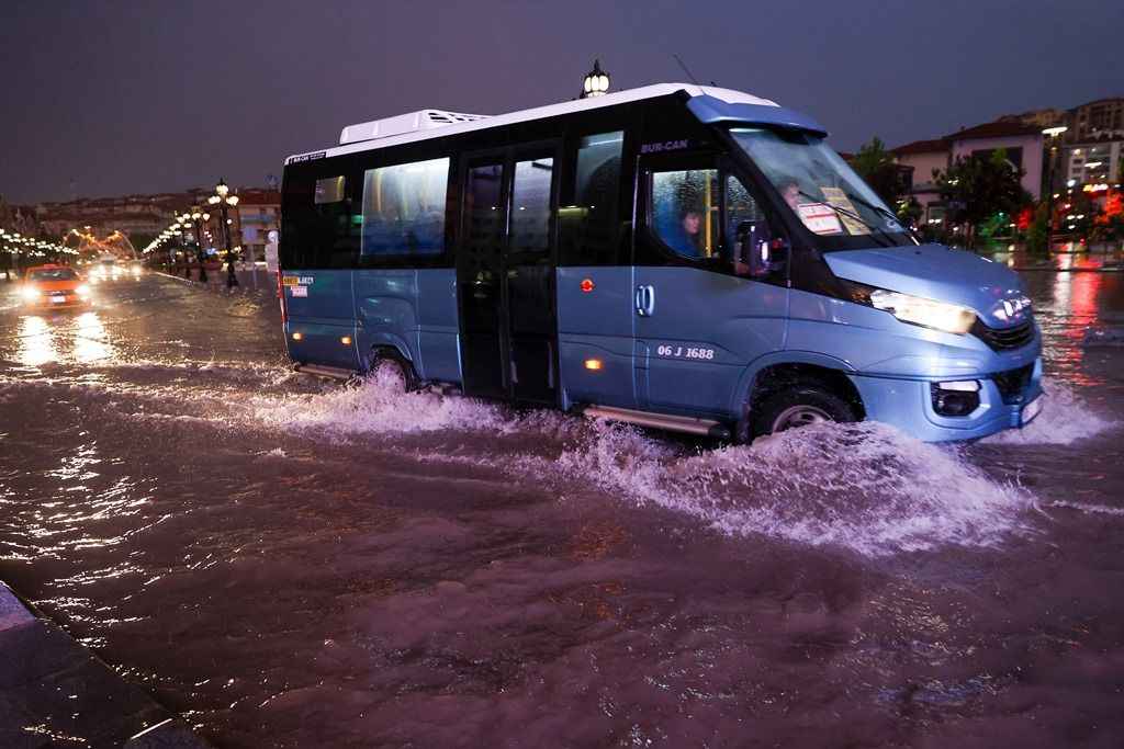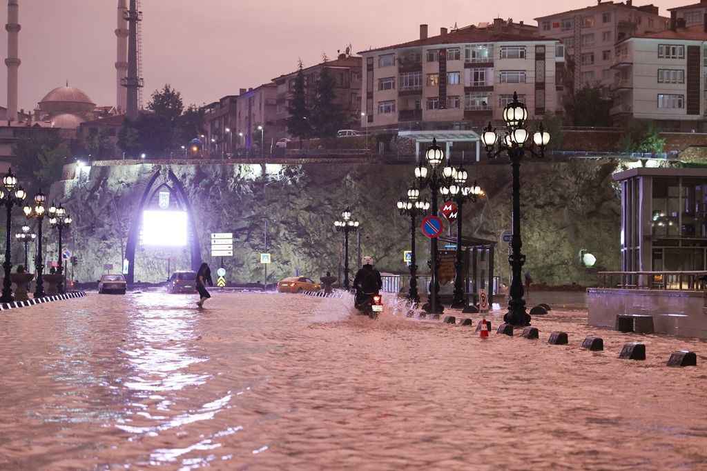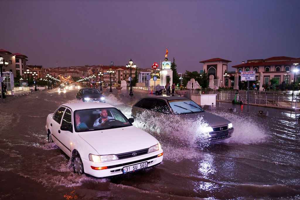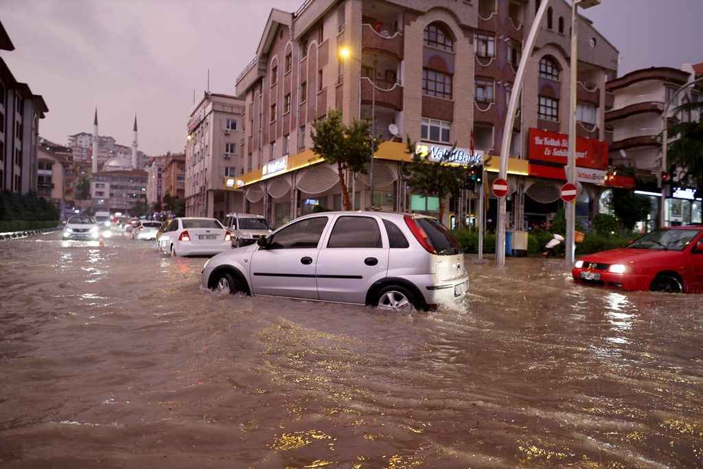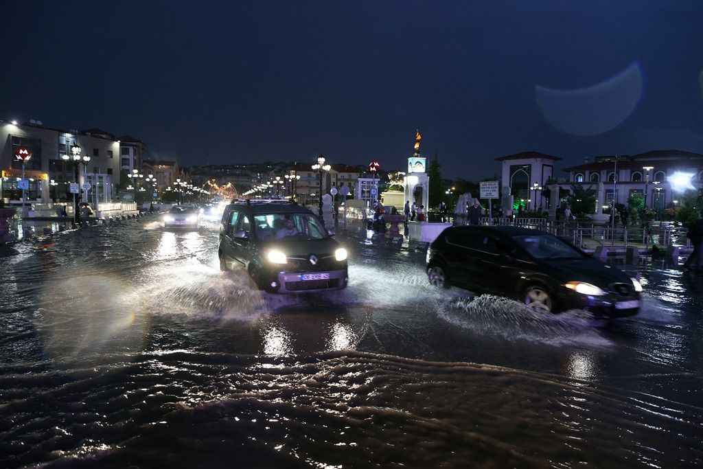 Su basan caddelerde sürücüler araçlarıyla ilerlemekte güçlük çekerken, bazı araçlar yol kenarında yağışın durması için kontak kapattı.