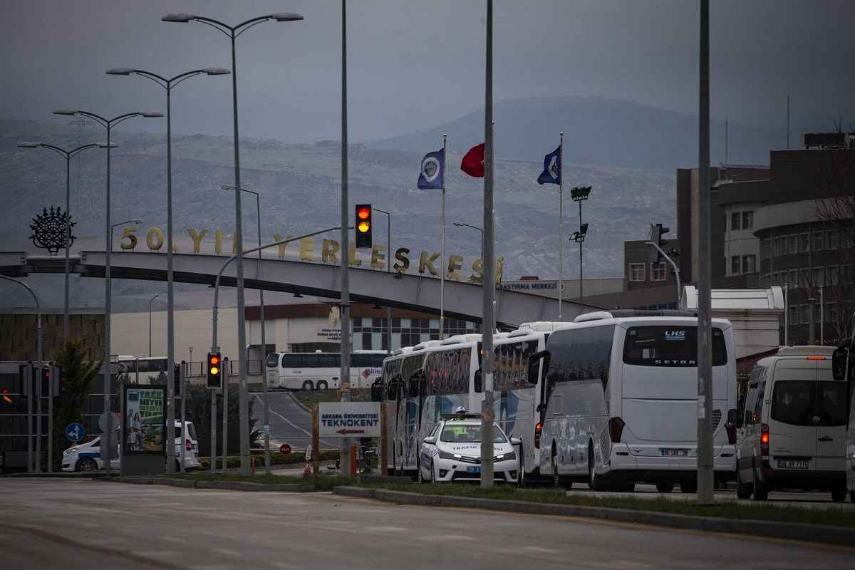 Ankara Üniversitesi Gölbaşı kampüsü içerisindeki KYK yurdunda karantinaya alınan umrecilerin, 14 günlük karantina süresini tamamlayıp test sonuçları negatif çıkanlarını memleketlerine götürecek otobüsler kampüse giriş yaptı.