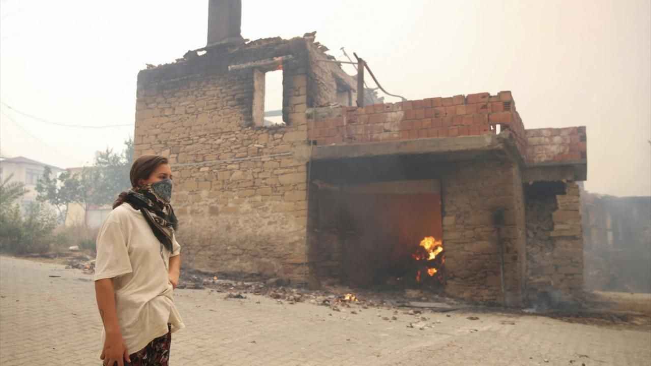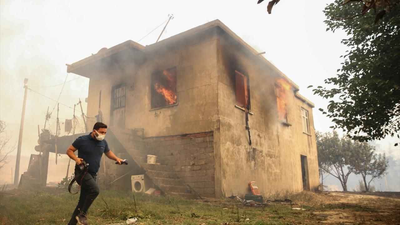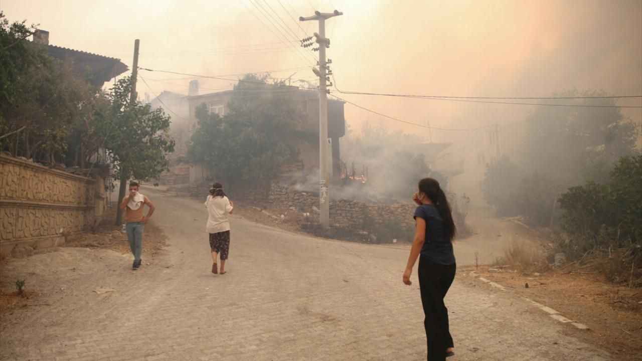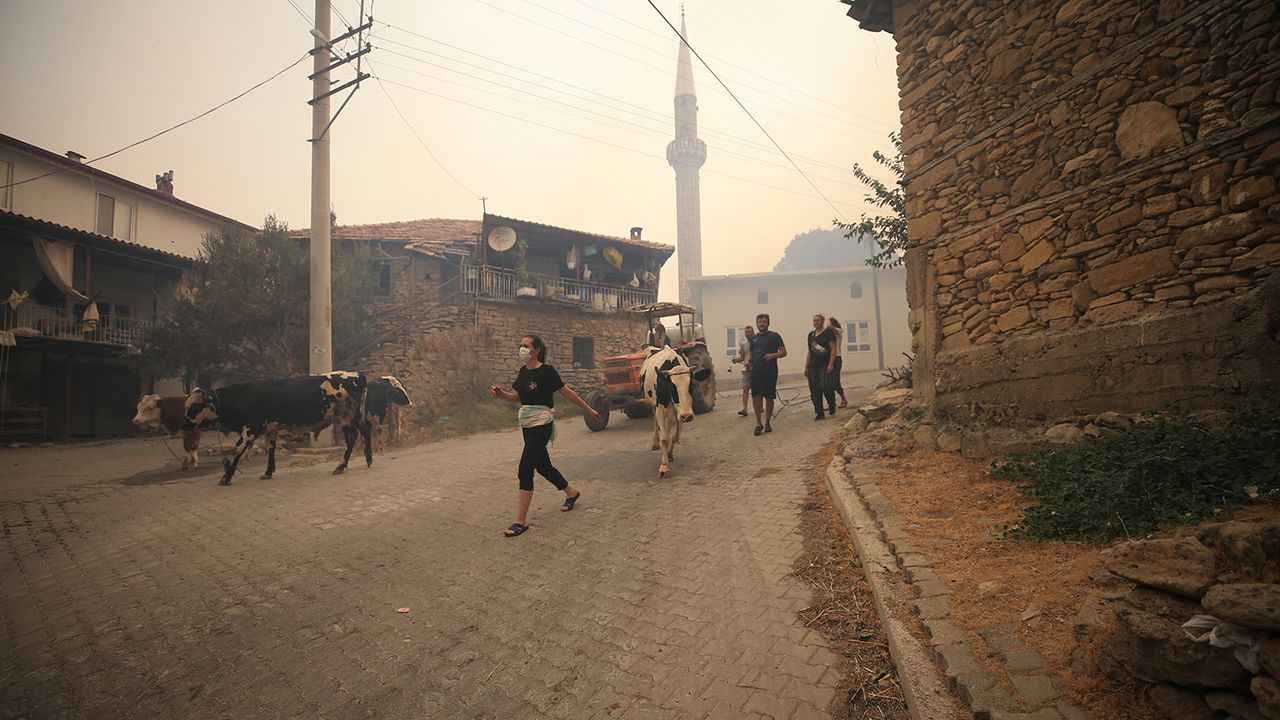 Vatandaşlar bir yandan evlerine ulaşan yangını bahçe hortumlarıyla söndürmeye çalışırken, bir yandan da hayvanlarını bölgeden uzaklaştırıyor.