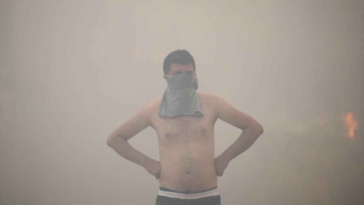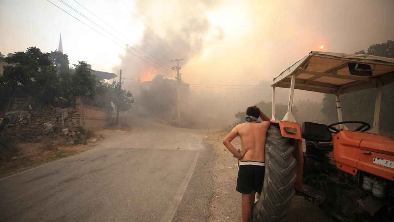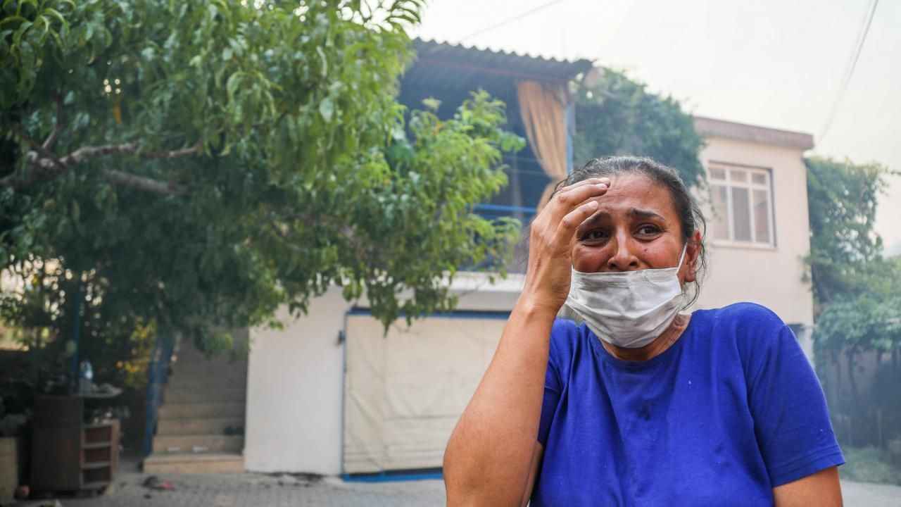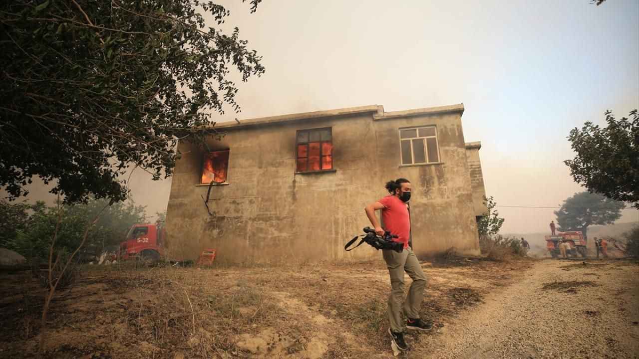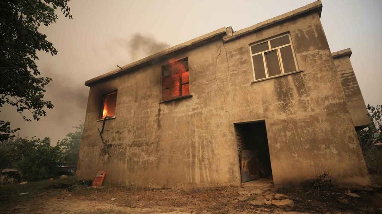 Vatandaşlar bir yandan evlerine ulaşan yangını bahçe hortumlarıyla söndürmeye çalışırken, bir yandan da hayvanlarını bölgeden uzaklaştırıyor.