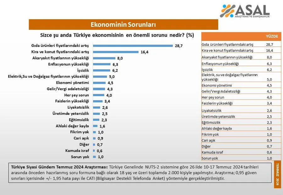 Asal Araştırma ve Danışmanlık da Türkiye Genelinde NUTS-2 sistemine göre 26 ilde 10-17 Temmuz 2024 tarihleri arasında önceden hazırlanmış soru formuna bağlı olarak 18 yaş ve üzeri toplam 2.000 kişiye "Türkiye ekonomisinin en önemli sorunu nedir?" diye sordu.