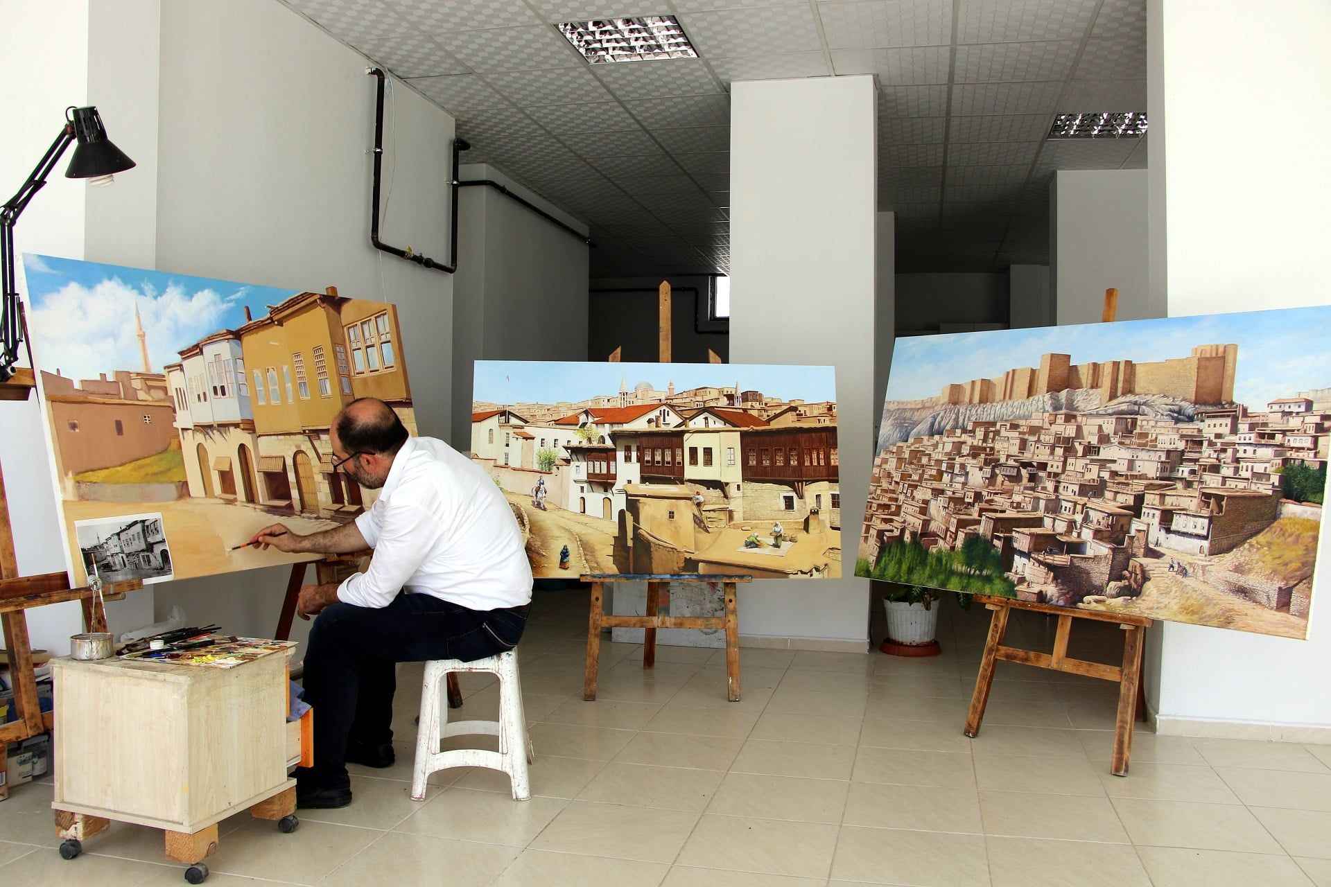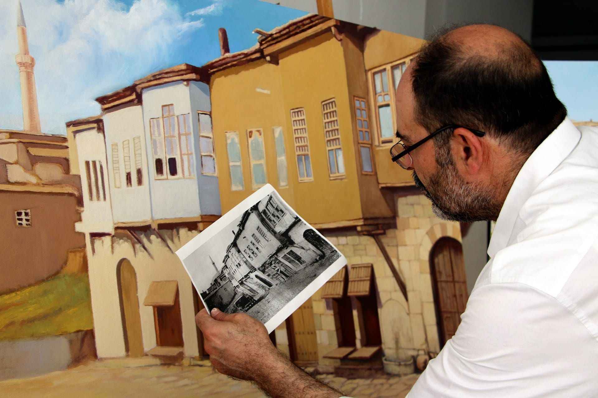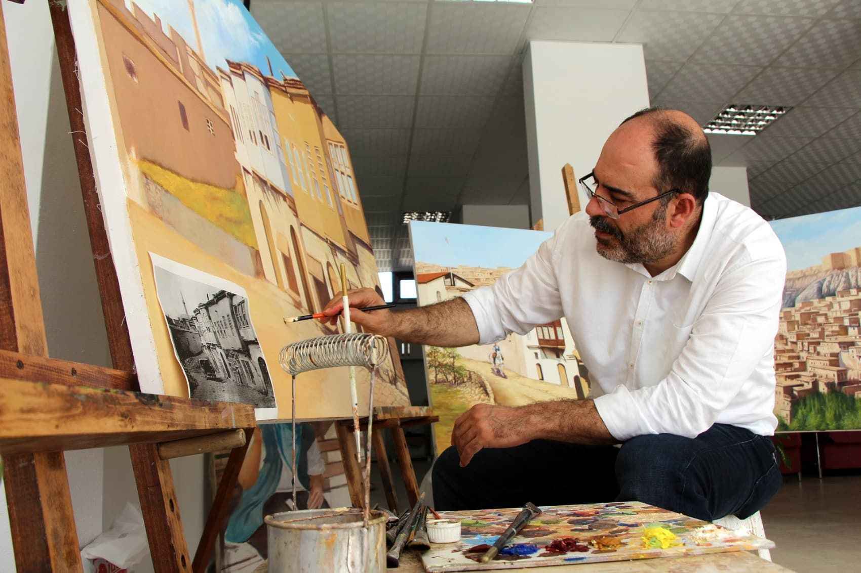 Elazığ Valiliği himayesinde, tarihi Harput Mahallesi'nde yürütülen "Harput Kale içi arkeolojik kazılarının gün yüzüne çıkarılması projesi" kapsamında, eski yıllarda çekilen siyah beyaz fotoğraflar, resim öğretmeni İsmet Ercan tarafından tuvale yansıtılıyor.